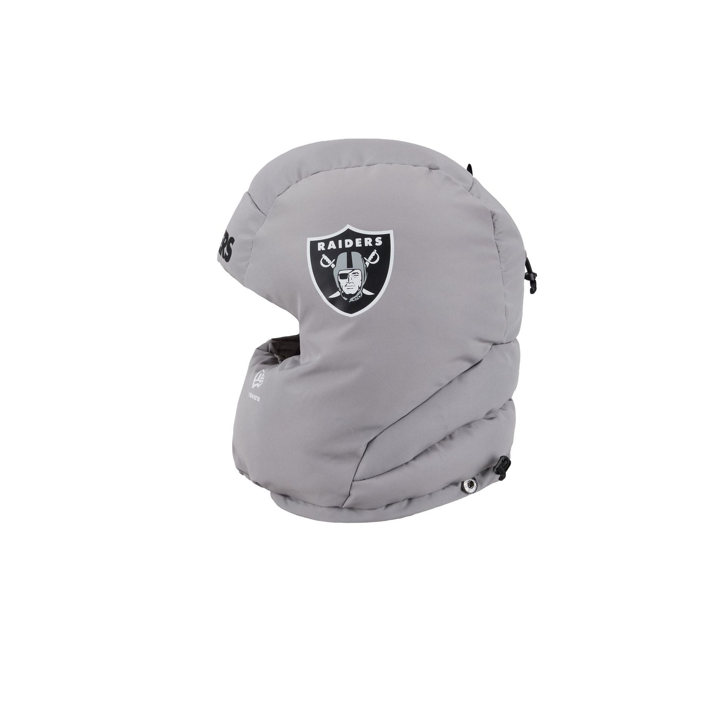 The Las Vegas Raiders Helmet Puffer Hood features a screen-printed Raiders wordmark at the front with a helmet design at each side. Additional details include an insulated filling with adjustable drawstrings at the back of the head and neck. The puffer helmet has a 4 snap-button closure at the right.