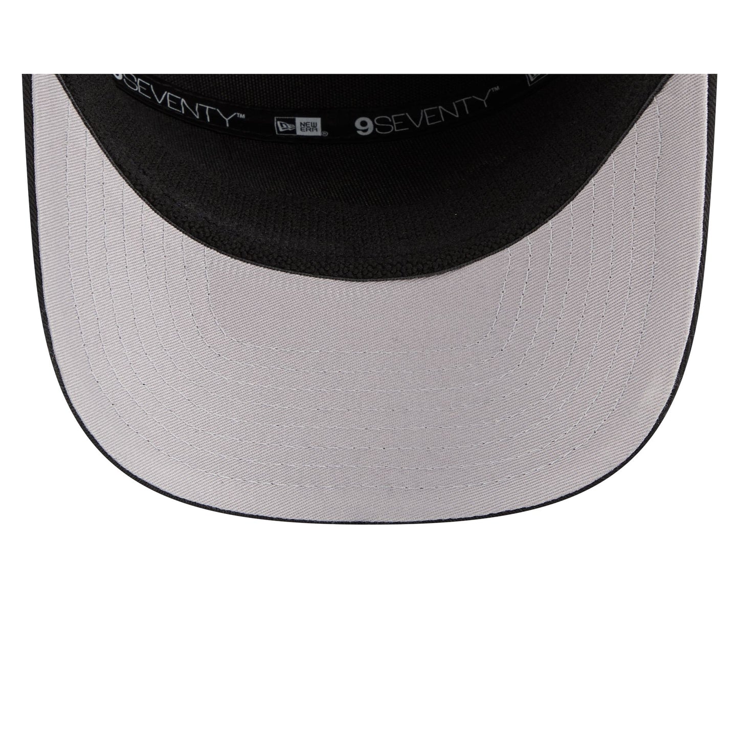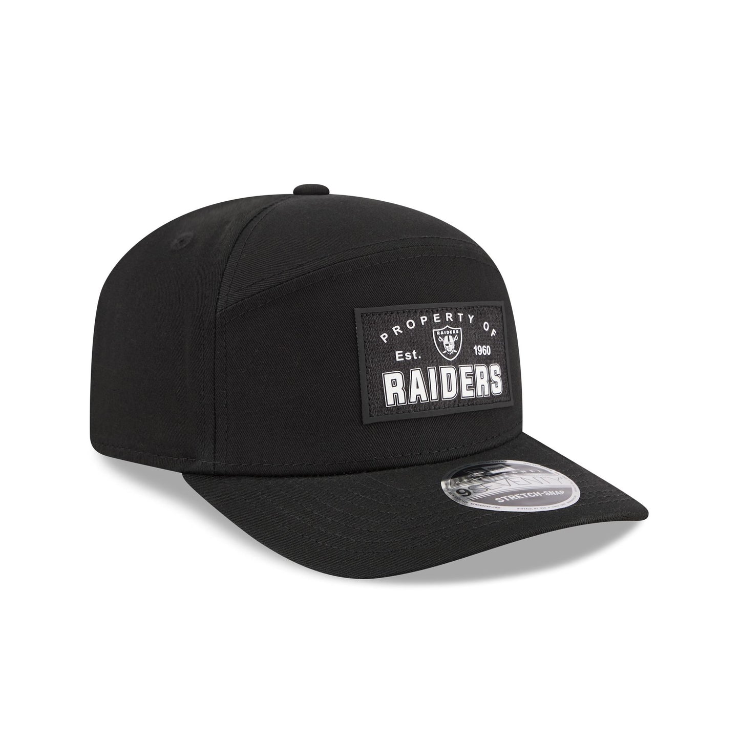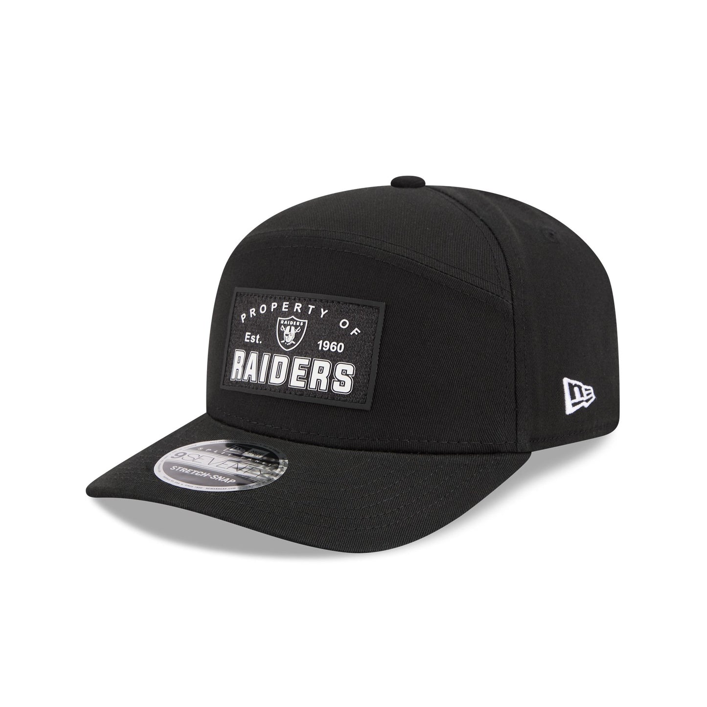 The Las Vegas Raiders Property of Patch Split Panel 9SEVENTY Stretch-Snap features a woven "Property of" Raiders patch a the front panels with a split crown construction. Additional details include an adjustable stretch-snap closure at the rear and a gray undervisor.