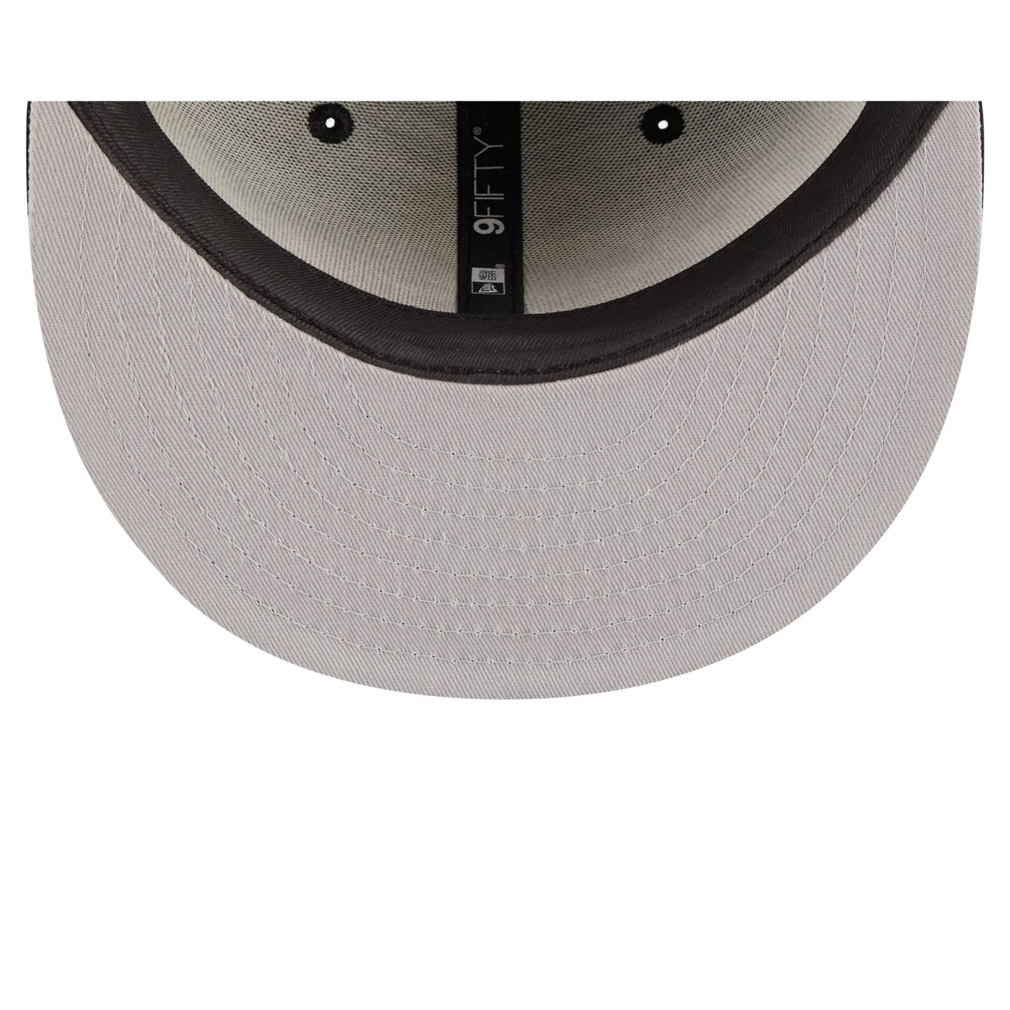 The Las Vegas Raiders Kids 9FIFTY Snapback Hat features an embroidered Raiders wordmark at the front panels with a matching team logo at the right-wear side. Additional details include a gray undervisor and a snapback closure at the rear.