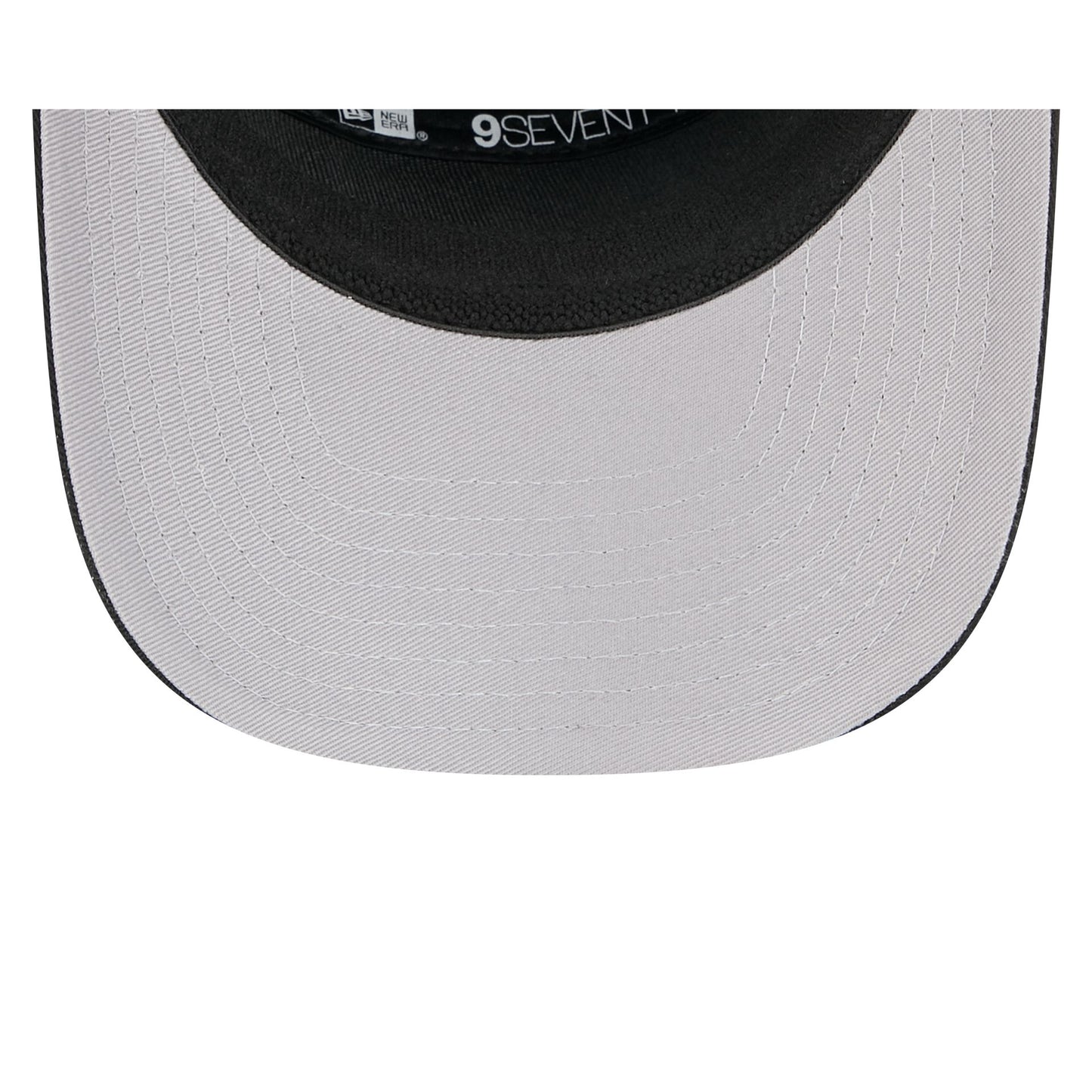 The Las Vegas Raiders Split Panel 9SEVENTY Stretch-Snap features an embroidered Raiders logo at the front panel with a split crown construction and a rope at the visor. Additional details include an adjustable stretch-snap closure at the rear and a gray undervisor.