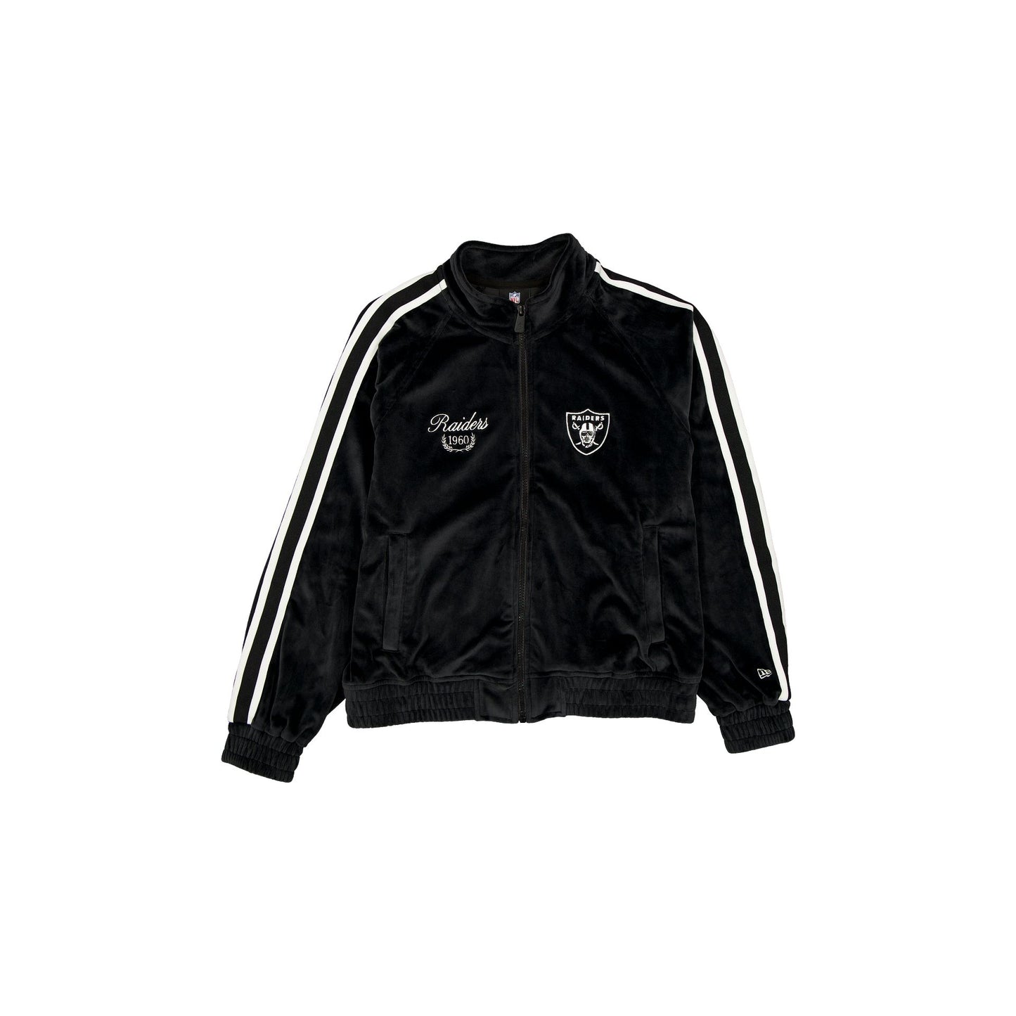 The Las Vegas Raiders Throwback Prep Black Women's Track Jacket features an embroidered Raiders logo at the left chest and script wordmark at the right. Additional details include a full-zip closure and front pockets.