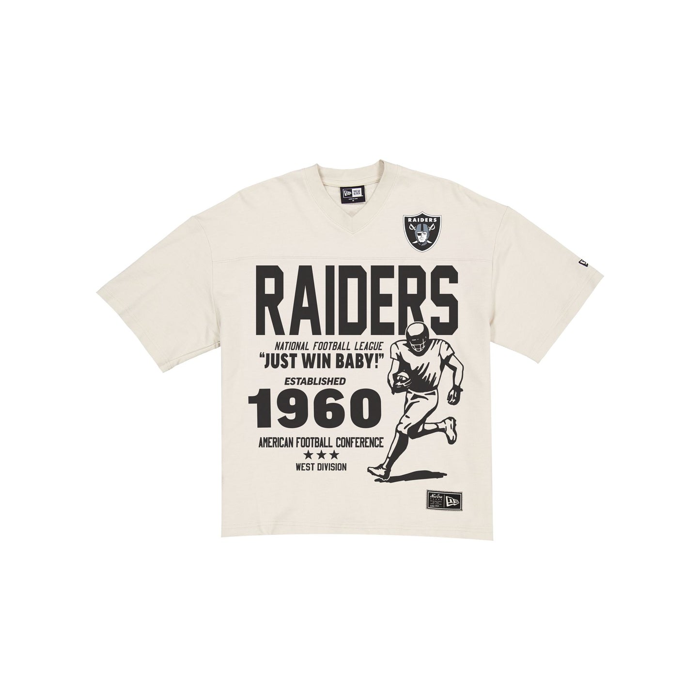 The Las Vegas Raiders Throwback Prep Stone T-Shirt features a screen-printed Raiders graphic at the front with a team logo at the left chest and a New Era jock tag at the left hip.