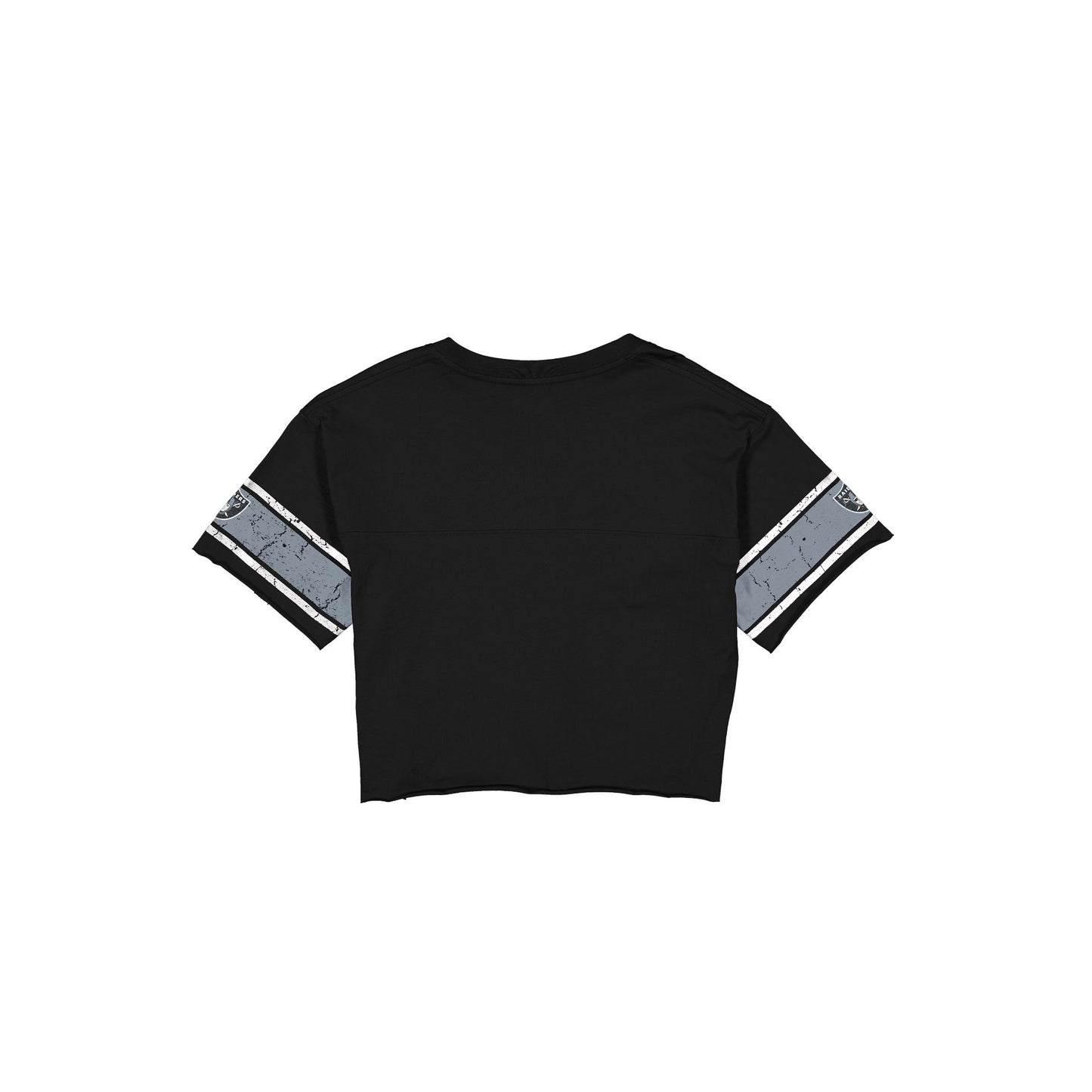 The Las Vegas Raiders Throwback Women's Cropped T-Shirt features a screen-printed Raiders graphic at the front with a New Era jock tag at the left hip.