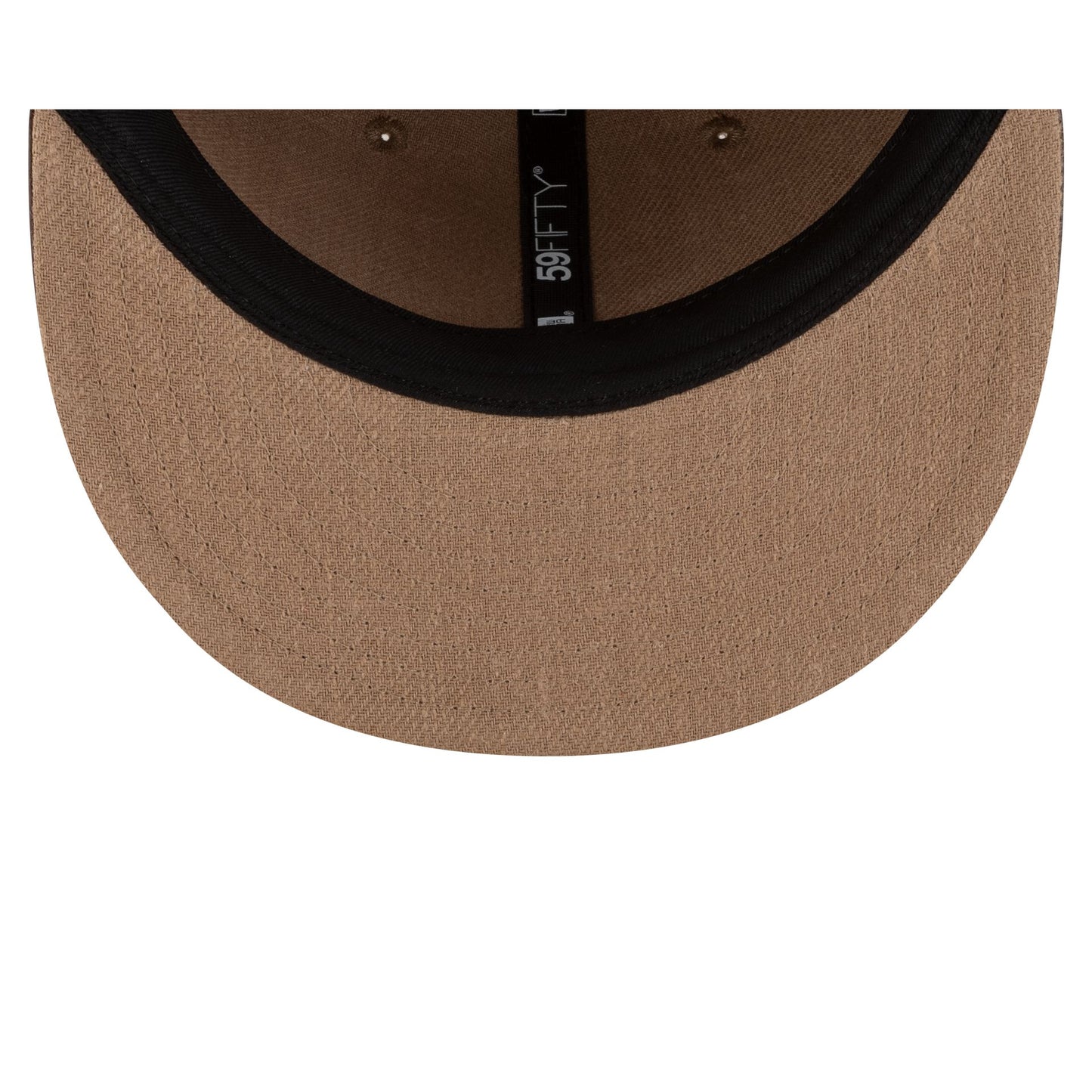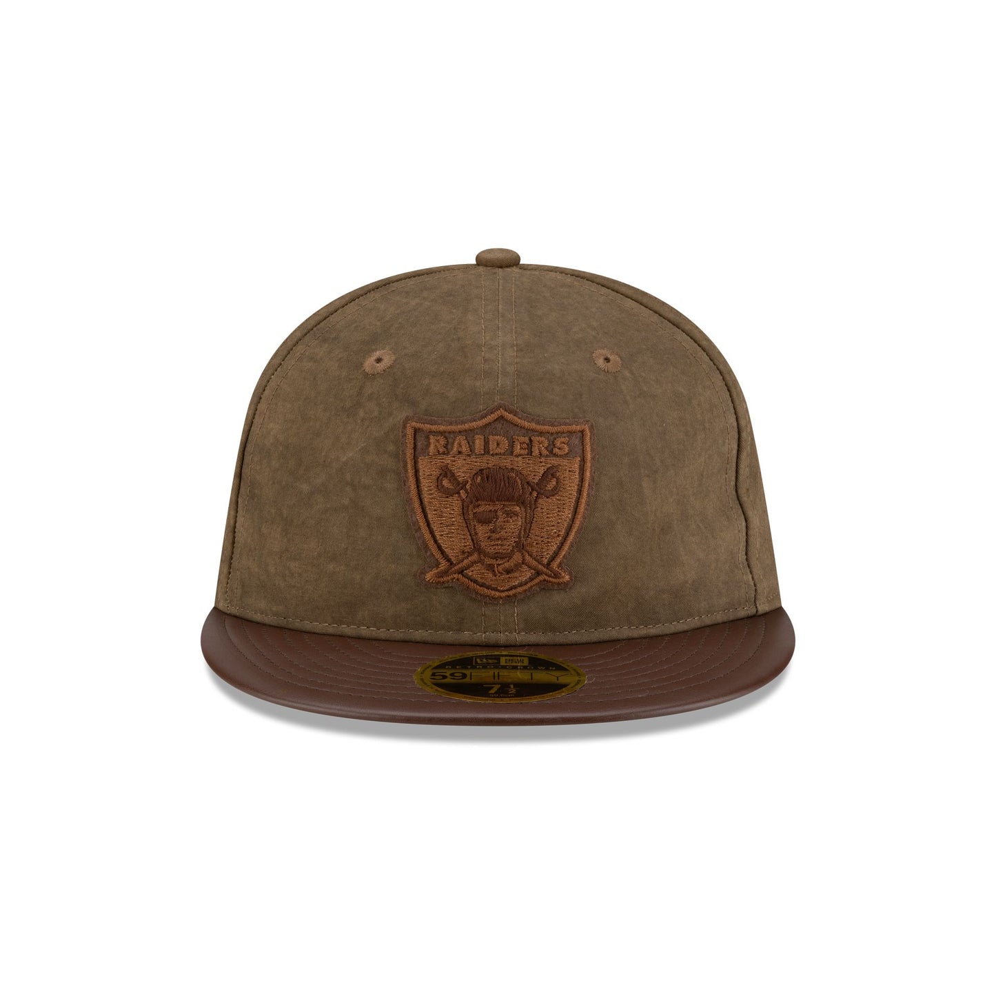 The Las Vegas Raiders Utility Linen Retro Crown 59FIFTY Fitted Cap features an embroidered Raiders logo at the front panels with a team patch at the right-wear side. Additional details include a faux leather visor and the NFL Shield logo at the rear.