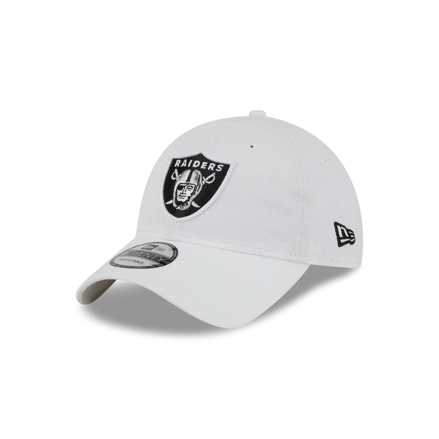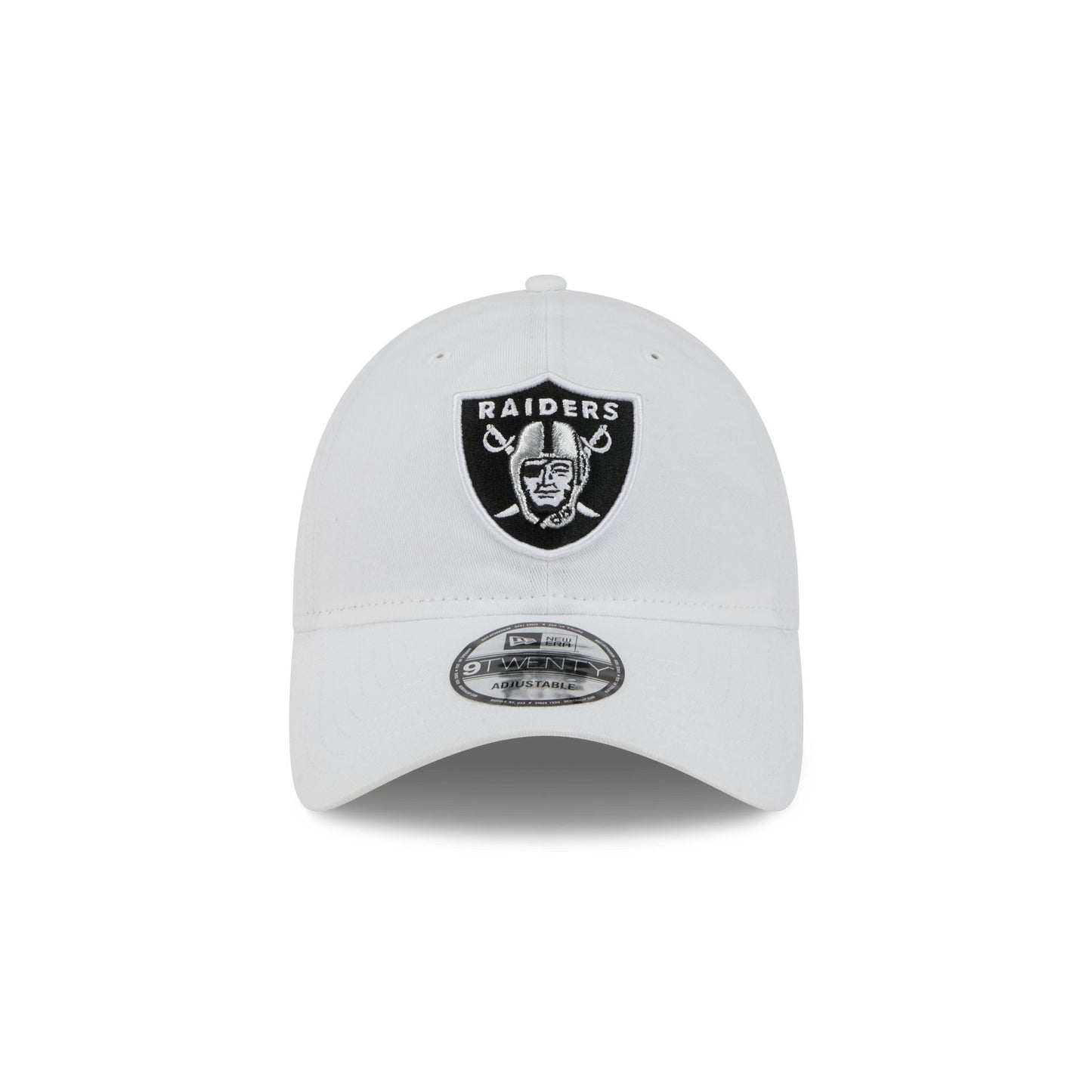 The Las Vegas Raiders White 9TWENTY Adjustable Cap features an embroidered Raiders logo at the front panel with a matching woven team logo tag at an adjustable D-Ring closure at the rear.