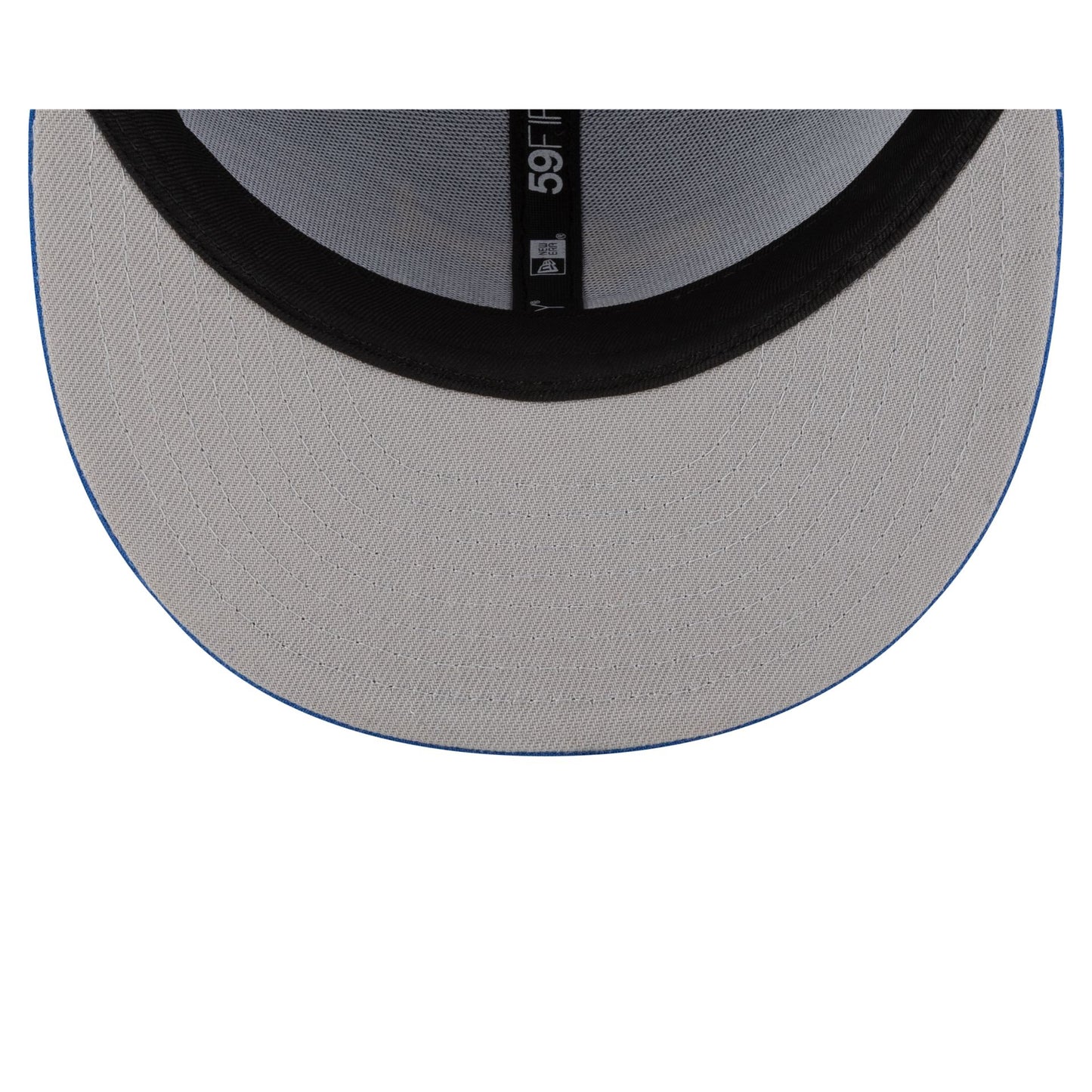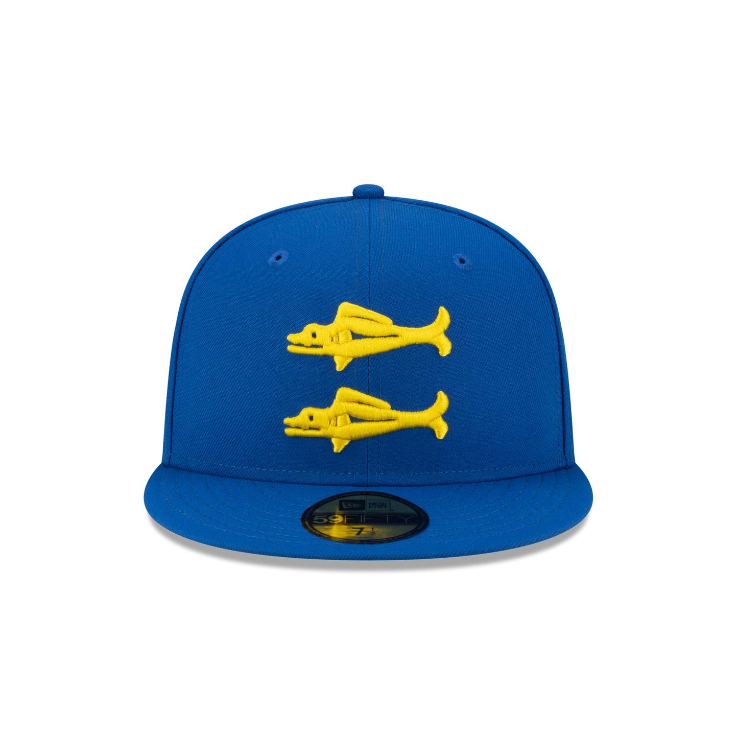 The Legends of the Hidden Temple Blue Barracuda 59FIFTY Fitted Cap features an embroidered Legends of the Hidden Temple Barracuda figures at the front panels with a Legends logo at the rear and a gray undervisor.