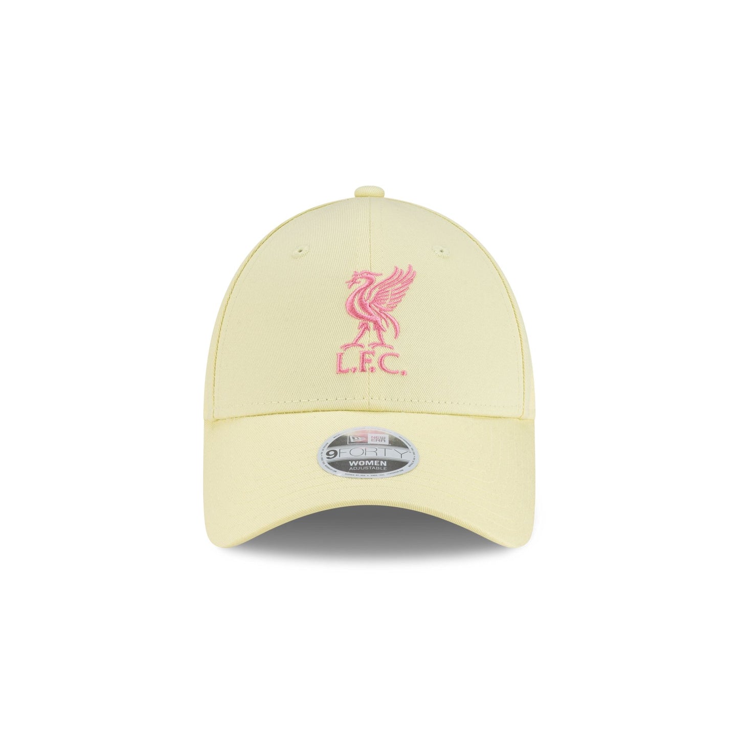The Liverpool FC Seasonal Pastel Yellow Women's 9FORTY Adjustable Cap features a pink embroidered Liverpool FC logo at the front panels with an adjustable D-Ring closure at the rear.