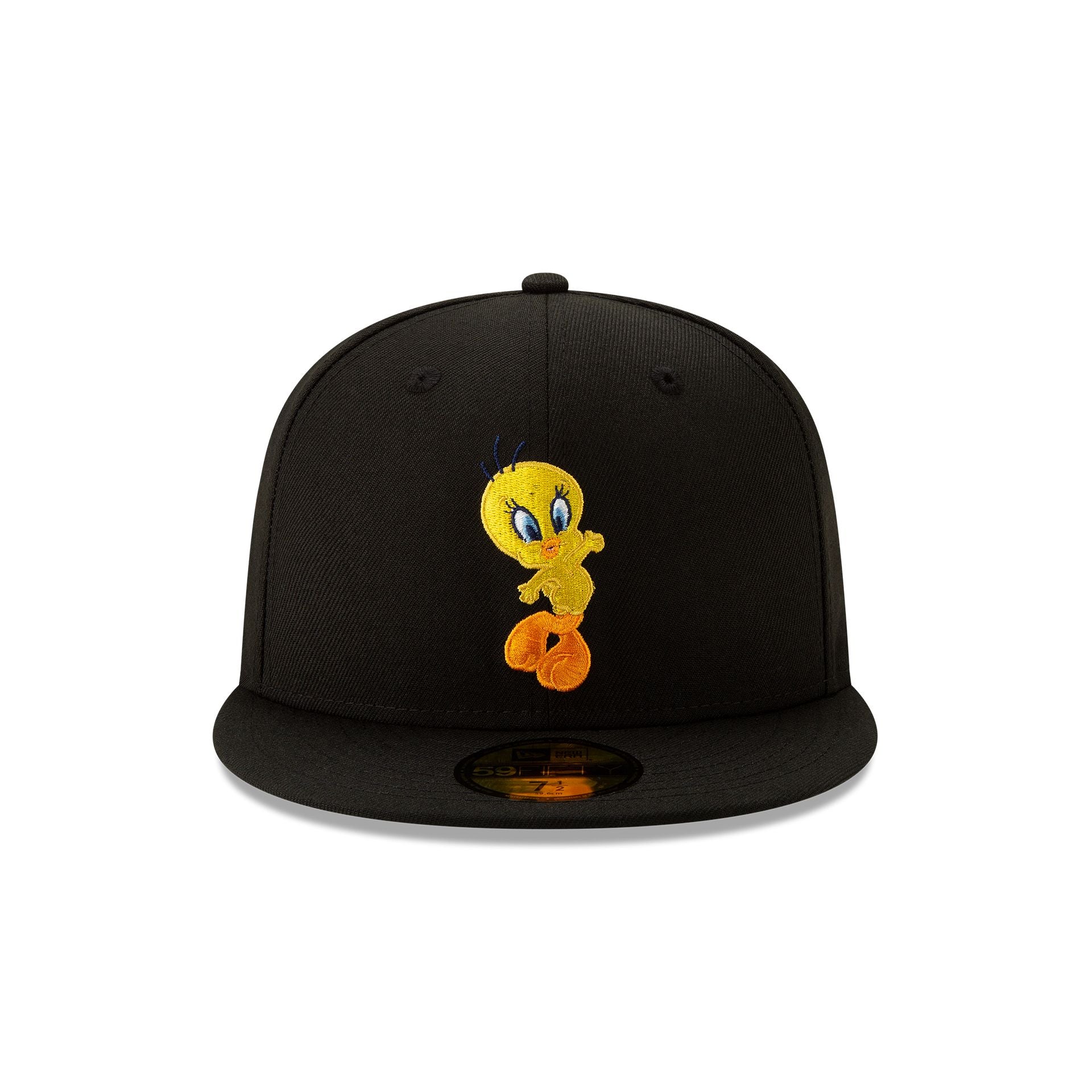 The Looney Tunes Tweety Bird Black 59FIFTY Fitted Cap features the character embroidered at the front panels with a Looney Tunes logo at the rear and a green undervisor.