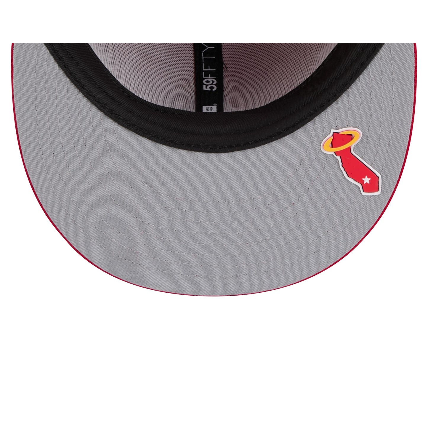 The Los Angeles Angels 2025 Clubhouse Alt 59FIFTY Fitted Cap features an embroidered Angels Cooperstown alternate logo at the front panels with a matching MLB Batterman logo at the rear. Additional details include a dashmark mesh fabrication and a silicone logo on a gray undervisor.