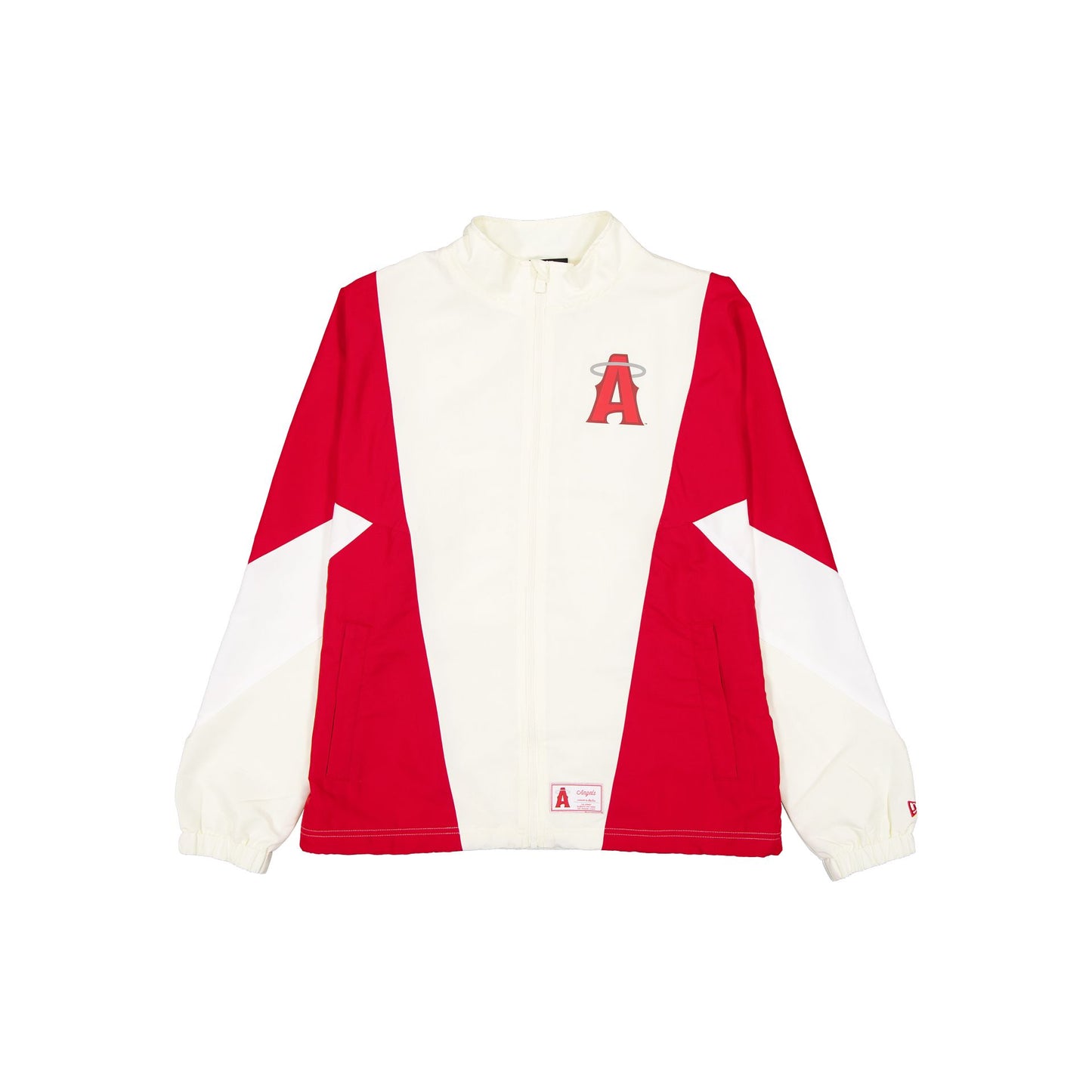 The Los Angeles Angels 2026 City Connect Color Block Windbreaker features a screen-printed Angels logo at the left chest with a matching team wordmark at the rear. Additional details include a full-zip closure at the front with side zip pockets, adjustable elastic drawstrings at the waist, and a woven team jocktag at the hem.