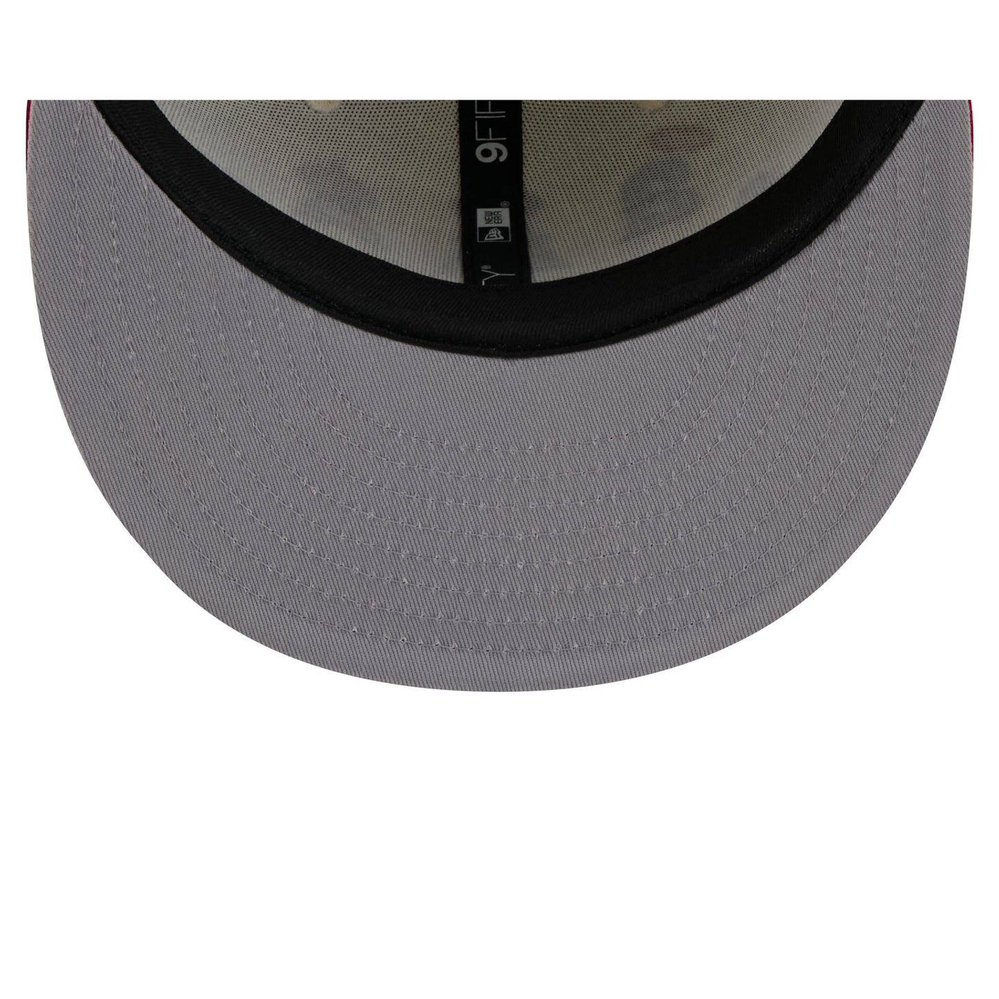 The Los Angeles Angels Archive 9FIFTY Snapback features an embroidered Angels wordmark and various team logos at the front panels with a snapback closure at the rear and a gray undervisor.