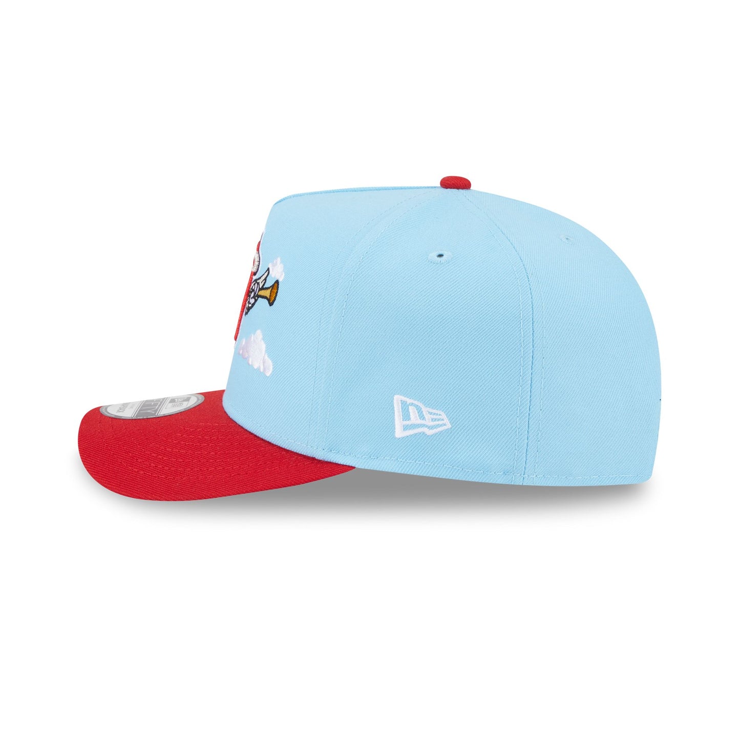The Los Angeles Angels Cartoon 9FIFTY A-Frame Snapback features an embroidered Angels cartoon logo at the front panels with a matching team logo at the right-wear side. Additional details include an adjustable snapback closure at the rear and a gray undervisor.
