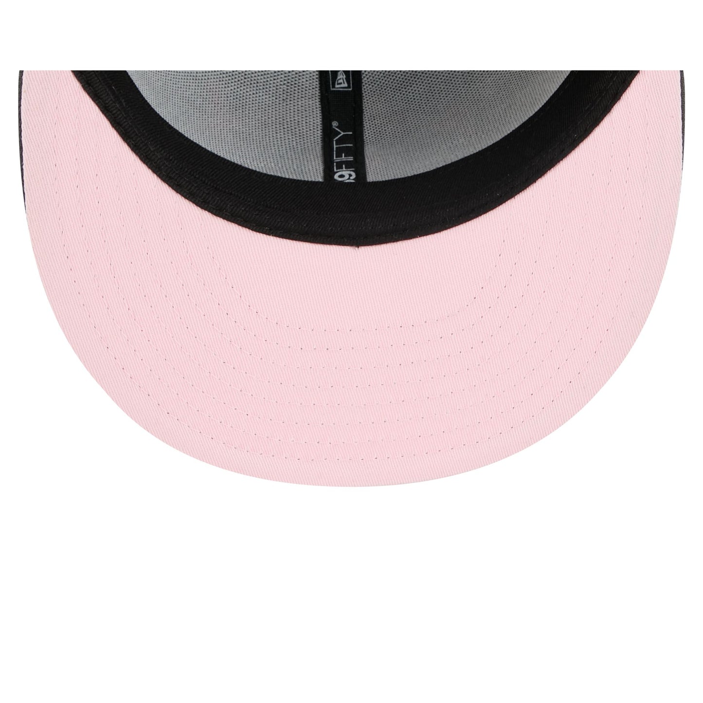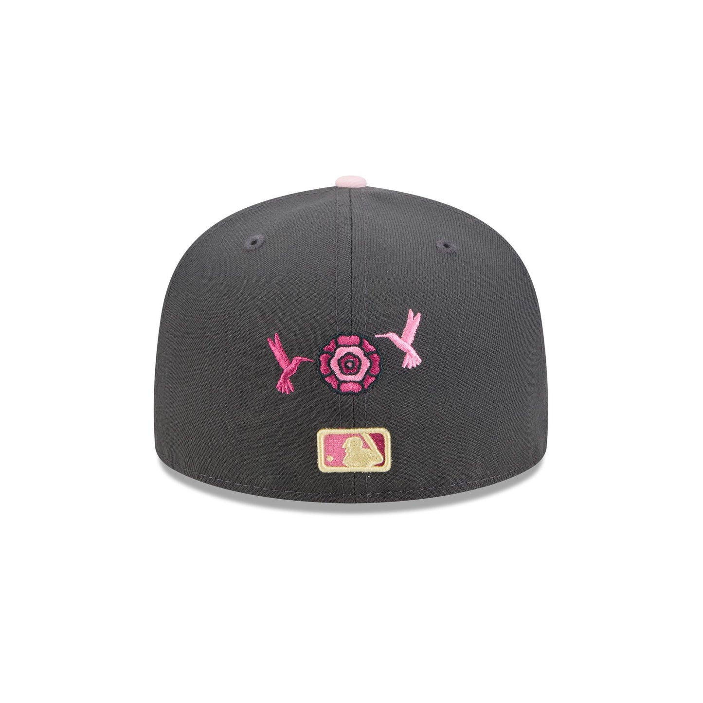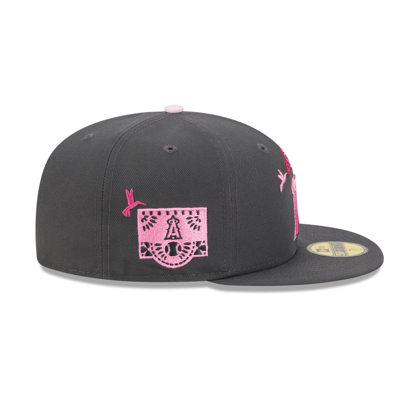 The Los Angeles Angels Day of the Dead Graphite 59FIFTY Fitted Cap features an embroidered Angels logo at the front panels with marigold (cempasúchil) and hummingbird designs throughout, representing the Legend of Xóchitl and Huitzilin. Additional details include a team patch at the right-wear side and a matching MLB Batterman logo at the rear.