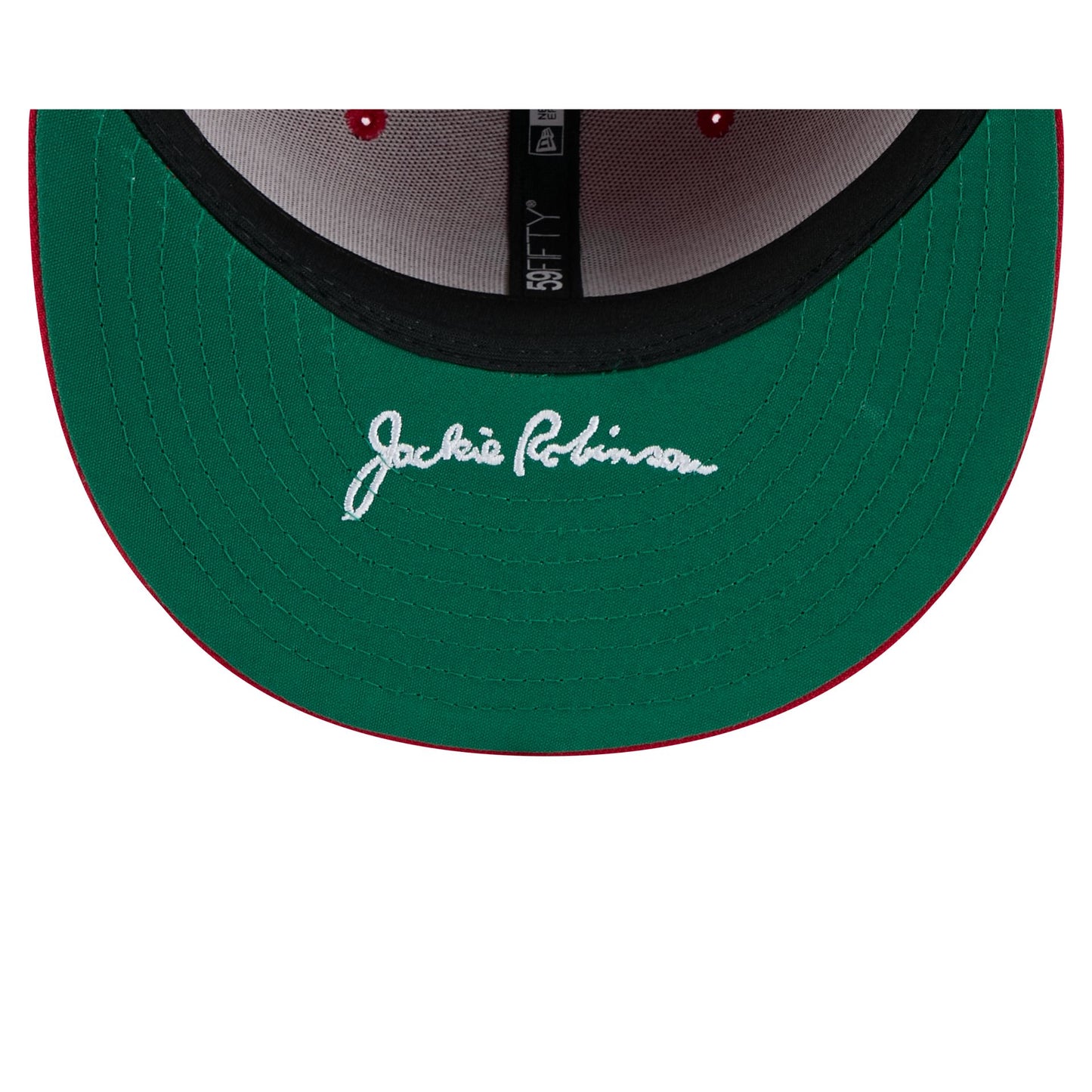The Los Angeles Angels Jackie Robinson Day 2025 59FIFTY Fitted Cap features an embroidered Angels logo at the front panels with an MLB Batterman logo at the rear. Additional details include a Jackie Robinson Breaking Barriers patch at the right-wear side and Robinson's embroidered signature on a green undervisor.
