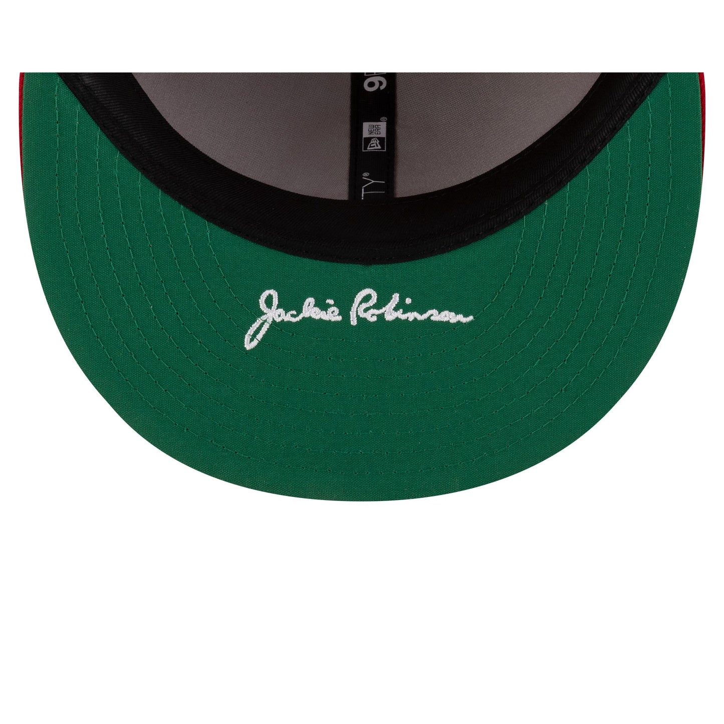 The Los Angeles Angels Jackie Robinson Day 2025 Retro Crown 9FIFTY Snapback features an embroidered Angels logo at the front panels with an MLB Batterman logo above a snapback closure at the rear. Additional details include a Jackie Robinson pin at the left panel and Robinson's embroidered signature on a green undervisor.