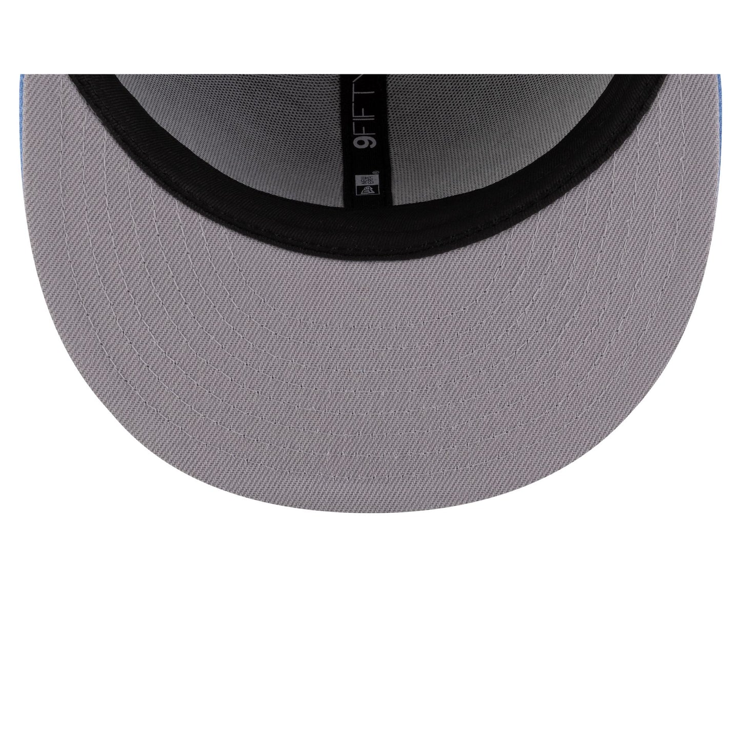 The Los Angeles Angels Mascot Light Navy 9FIFTY Snapback features an embroidered Angels mascot at the front panels with a 40th Season patch at the right-wear side. Additional details include a snapback closure at the rear and a gray undervisor.