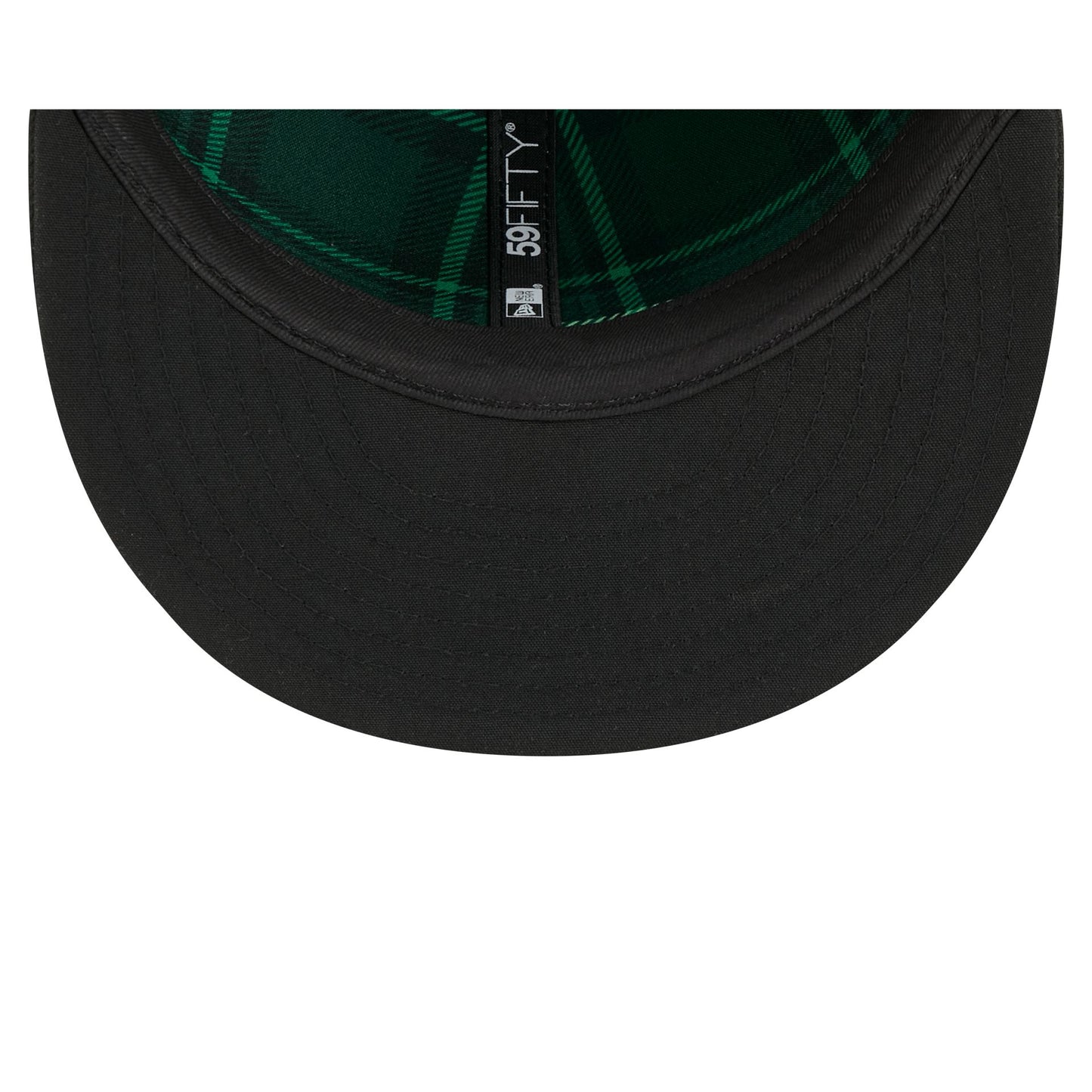 The Los Angeles Angels St. Patrick's Day 2026 59FIFTY Fitted Cap features a green and gold embroidered Angels logo at the front panels with a matching MLB Batterman logo at the rear and a mini shamrock at the top right. Additional details include a team wordmark over a metallic green shamrock baseball diamond patch at the right-wear side with a green plaid interior fabrication at the front panels.