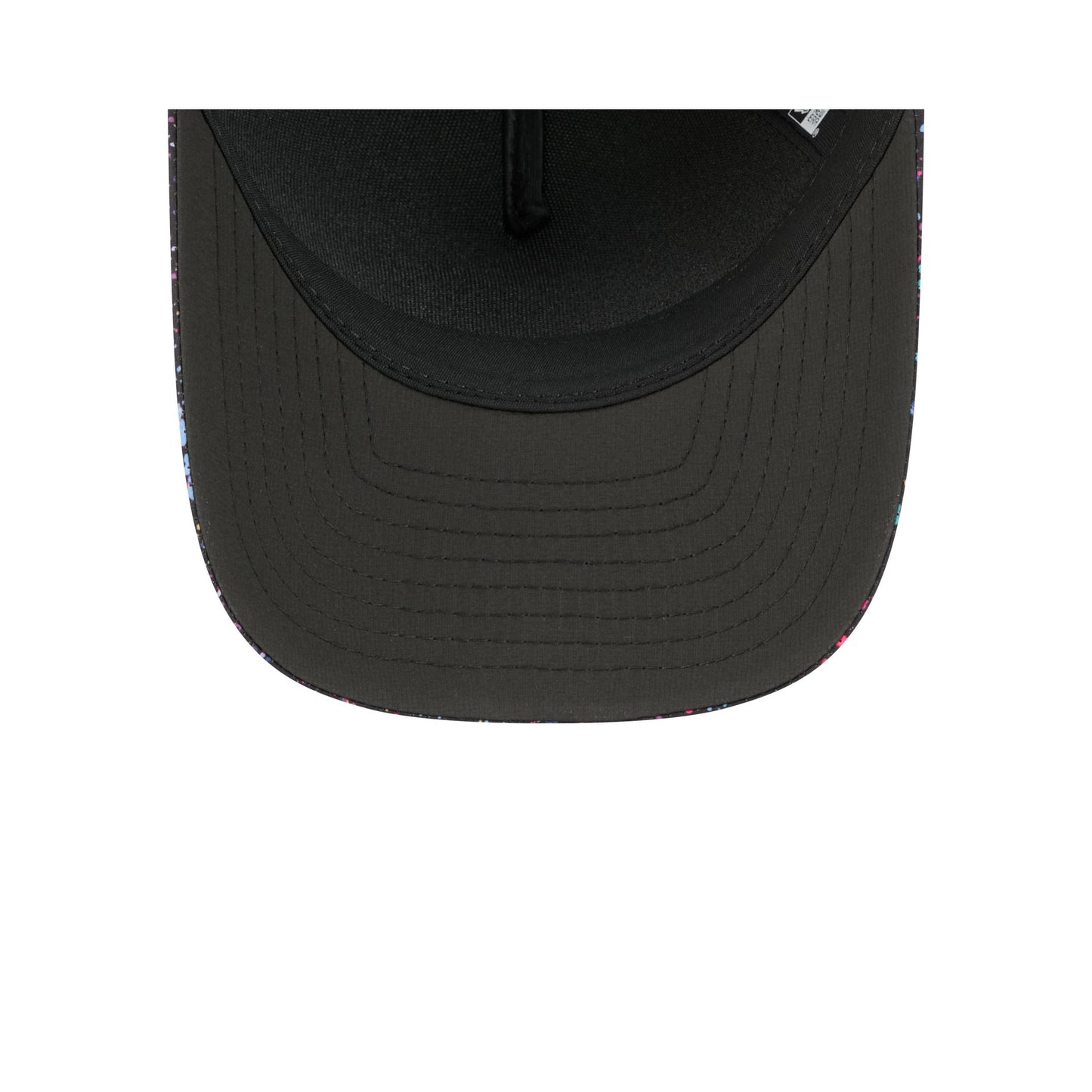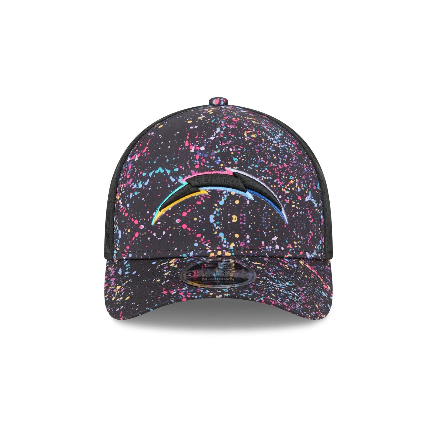 The Los Angeles Chargers 2025 Crucial Catch 9FORTY M-Crown A-Frame Trucker features an embroidered Chargers logo at the front paint splatter panels with a woven NFL Shield tag above a snapback closure at the rear. Additional details include a Crucial Catch Intercept Cancer patch at the right-wear side with performance mesh rear panels and a black undervisor.