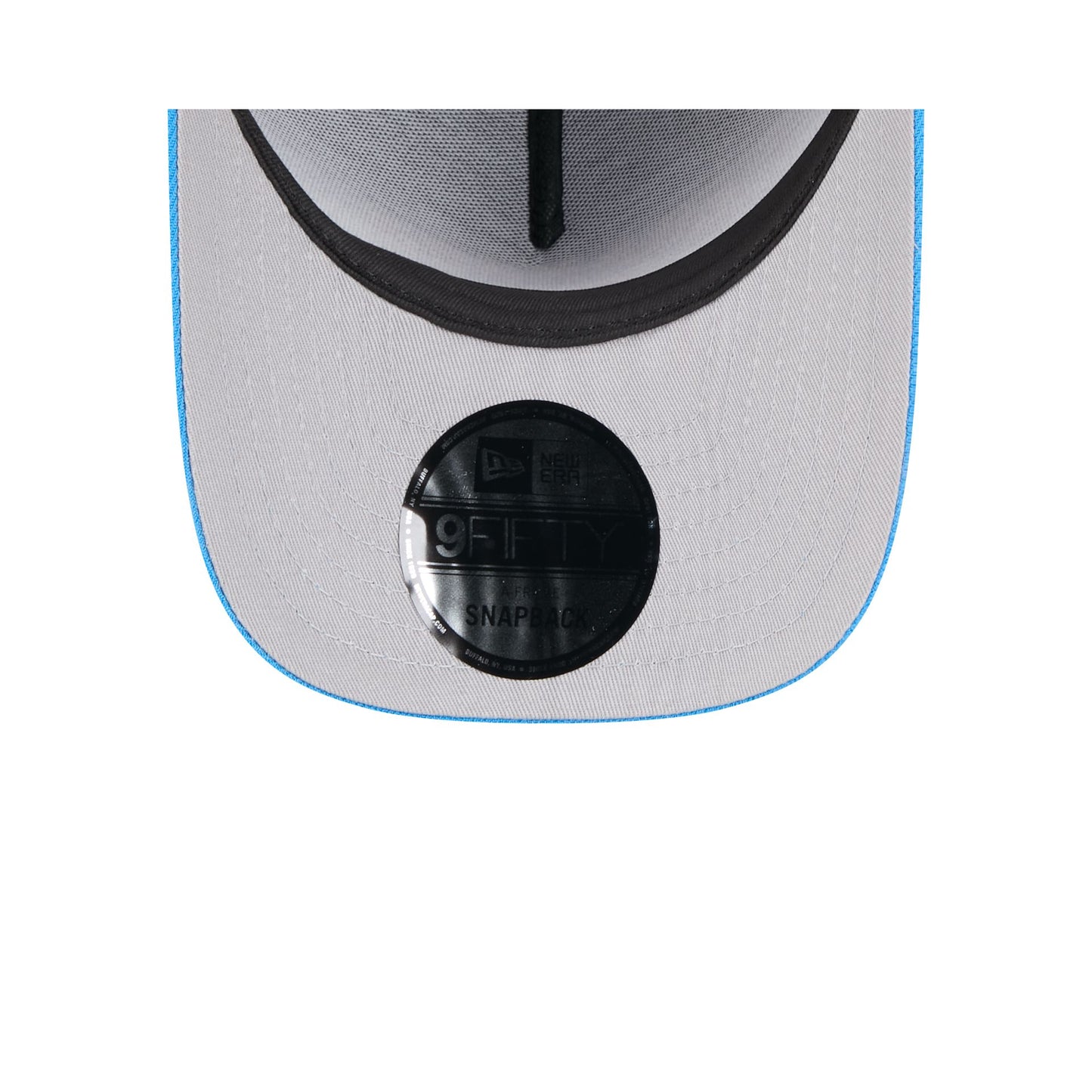 The Los Angeles Chargers 2025 Draft 9FIFTY A-Frame Snapback features an embroidered Chargers logo and wordmark at the front panels with an NFL Shield logo above a snapback closure at the rear. Additional details include ornamental stitched details at the visor and a gray undervisor.