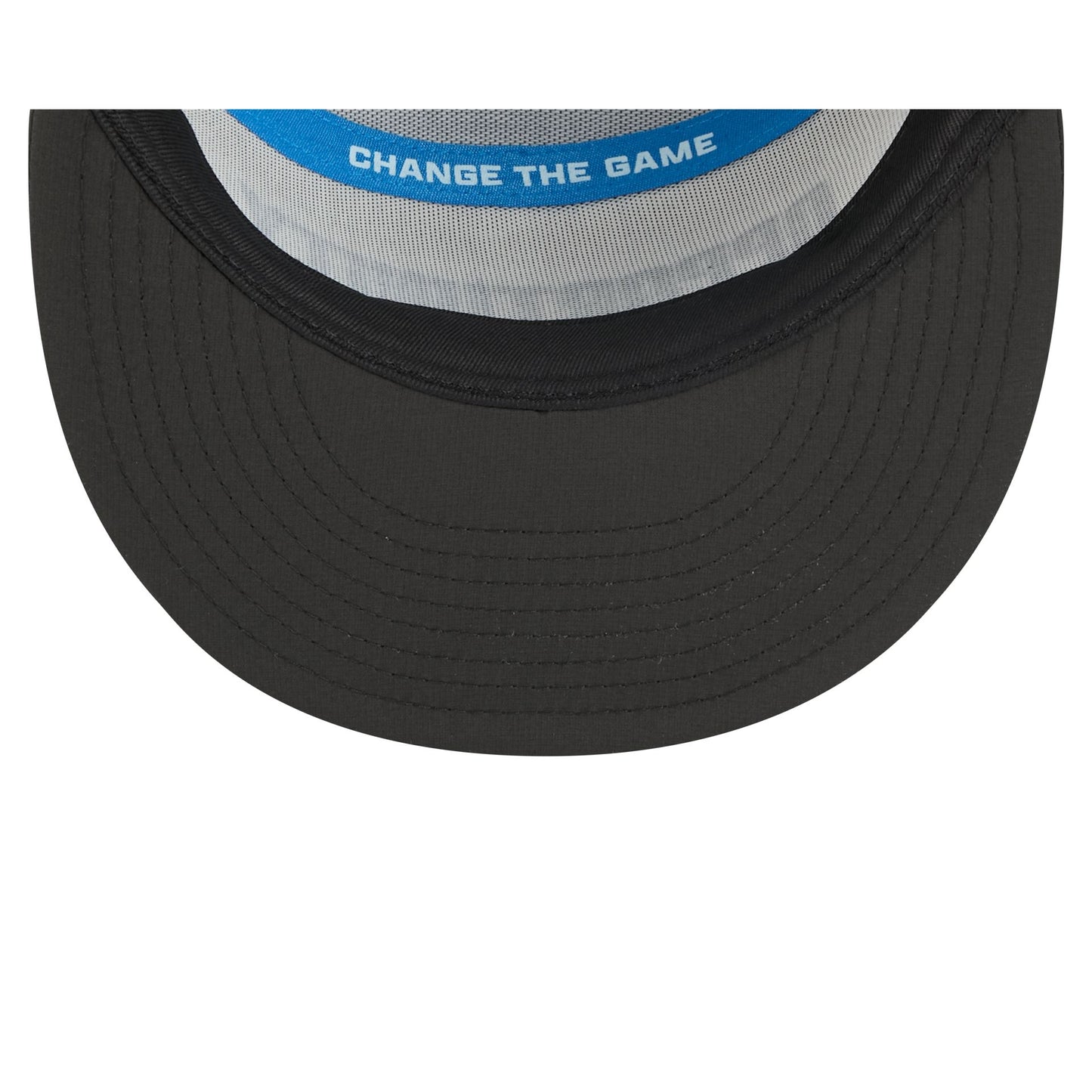 The Los Angeles Chargers 2025 Inspire Change Split Panel 9FIFTY Snapback features an embroidered Chargers logo and matching "Opportunity" wordmark at the front panels with an NFL Inspire Change patch at the right-wear side. Additional details include a rope at the visor and an adjustable snapback closure at the rear. The cap has a split crown construction.