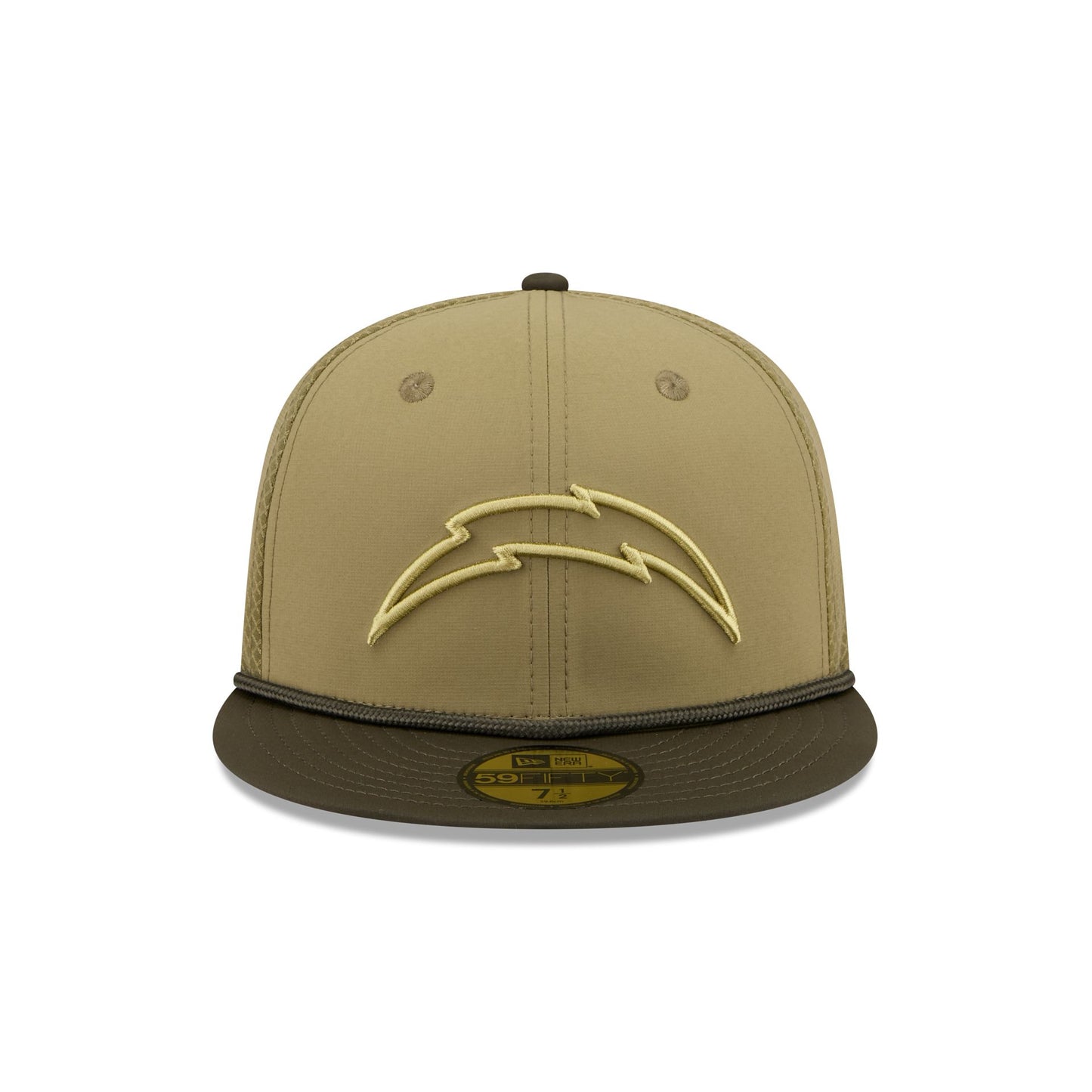 The Los Angeles Chargers 2025 Salute to Service 59FIFTY Fitted Cap features an embroidered Chargers logo at the front panels with the official NFL Salute to Service patch at the rear mesh panels. Additional details include an American flag patch at the right-wear side with a silicone team logo patch at a dark green undervisor and a digi camo interior fabrication.