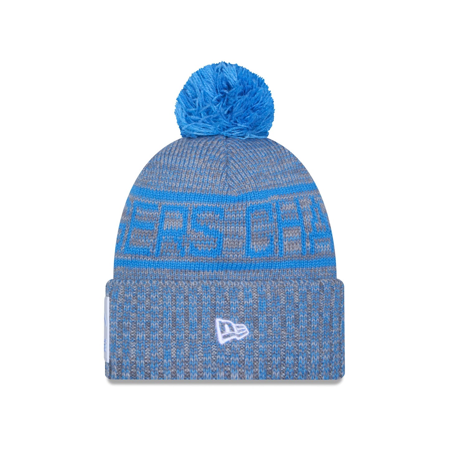 The Los Angeles Chargers 2025 Sideline Cold Weather Gray Pom Knit Hat features a sewn-down silicone Chargers white logo patch at the front cuff with a matching Official NFL Shield logo at the rear. Additional details include a team wordmark across the crown, a one-time removeable pom, and a fleece lining.