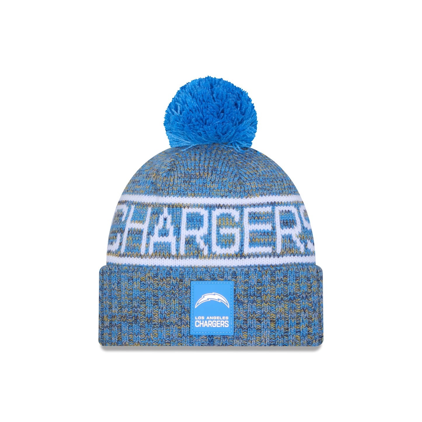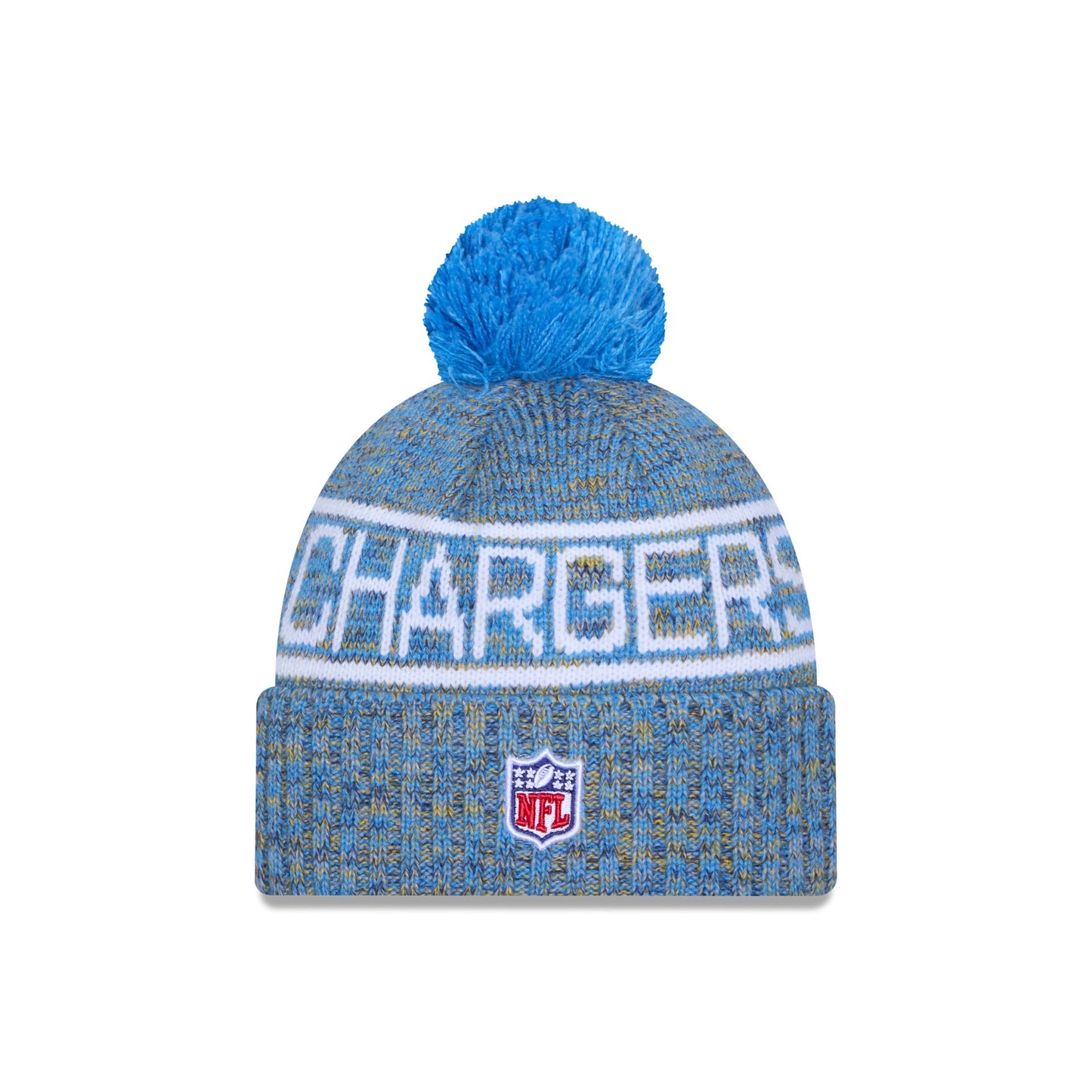 The Los Angeles Chargers 2025 Sideline Cold Weather Pom Knit Hat features a sewn-down silicone Chargers logo patch at the front cuff with a matching Official NFL Shield logo at the rear. Additional details include a team wordmark across the crown, a one-time removeable pom, and a fleece lining.