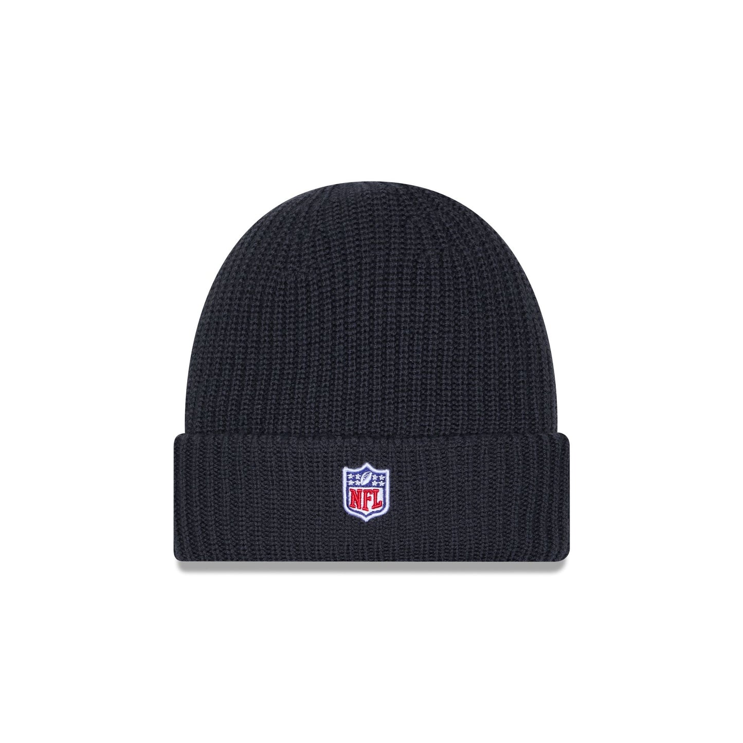 The Los Angeles Chargers 2025 Sideline Cold Weather Steel Clouds Cuff Knit Beanie features a sewn-down silicone Chargers logo patch at the front cuff with a matching Official NFL Shield logo at the rear. The beanie is knit from wool yarn and lined with fleece.