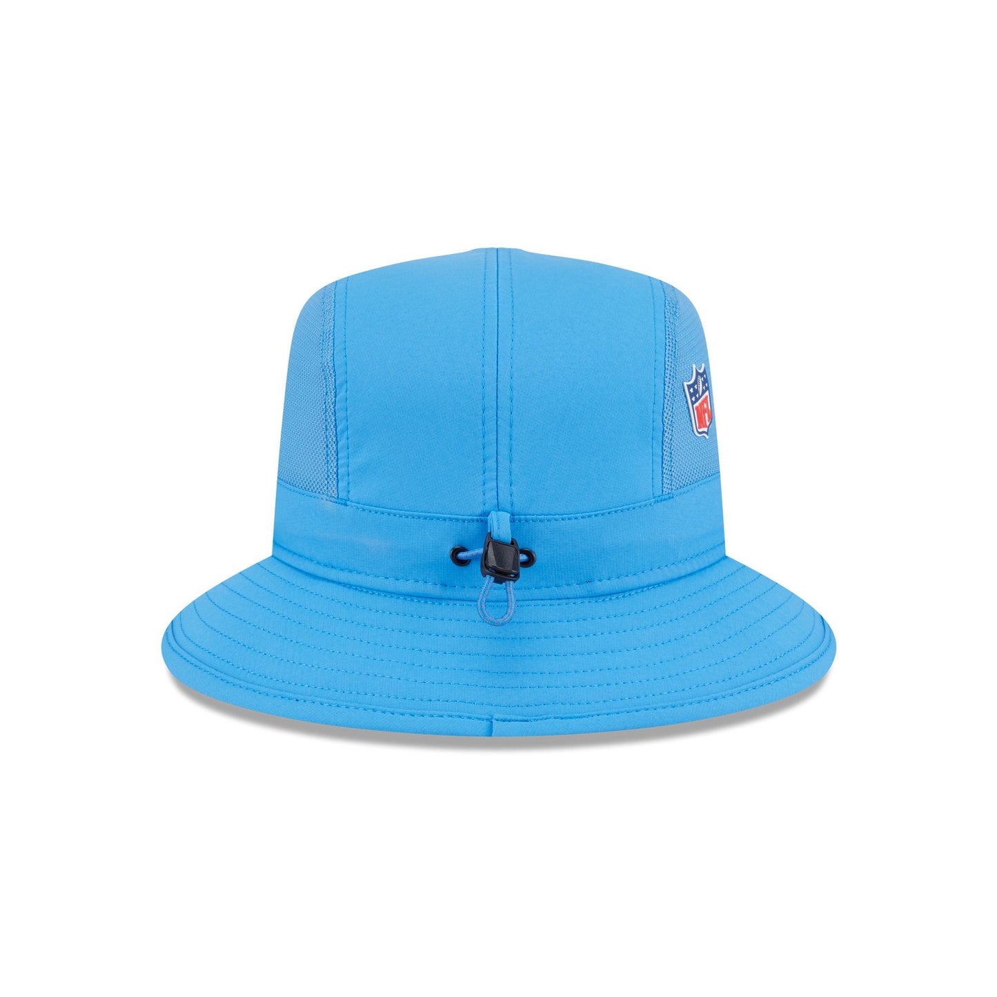 The Los Angeles Chargers 2025 Sideline Hot Weather Bucket Hat features a sewn-down silicone Chargers logo patch at the front with the Official NFL Shield logo at the right-wear side. Additional details include breathable mesh side panels and an adjustable reflective drawstring at the rear.