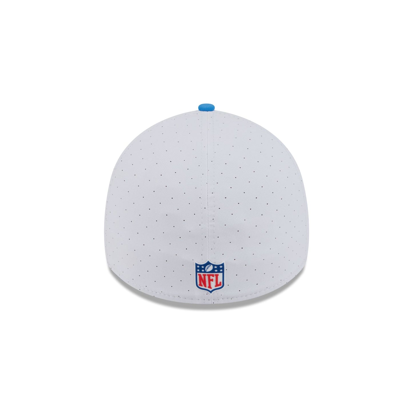 The Los Angeles Chargers 2025 Training 39THIRTY Stretch Fit Cap features a silicone Chargers patch at the front panels with team color stripes at the front of a blue visor and a silicone NFL Shield patch at the rear.