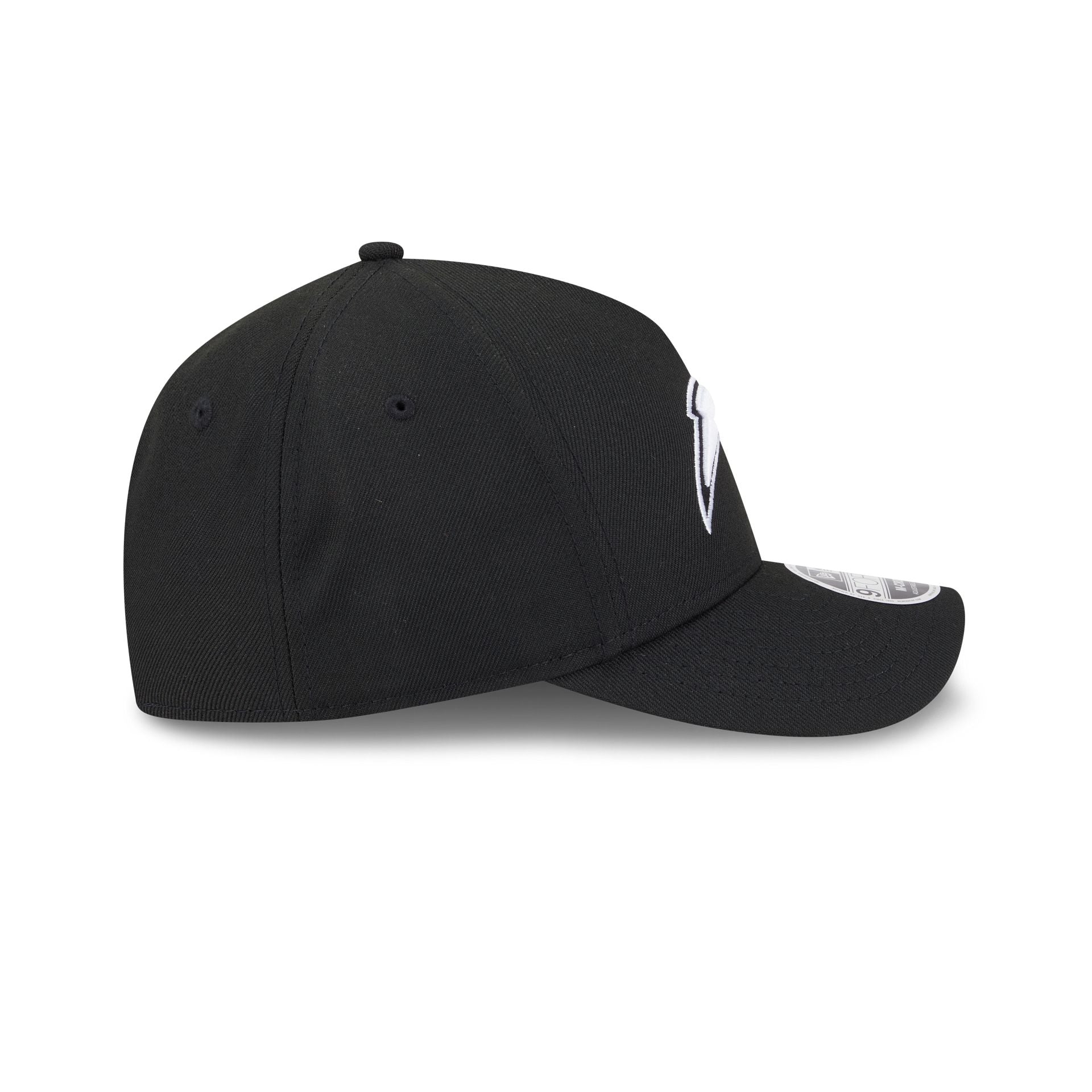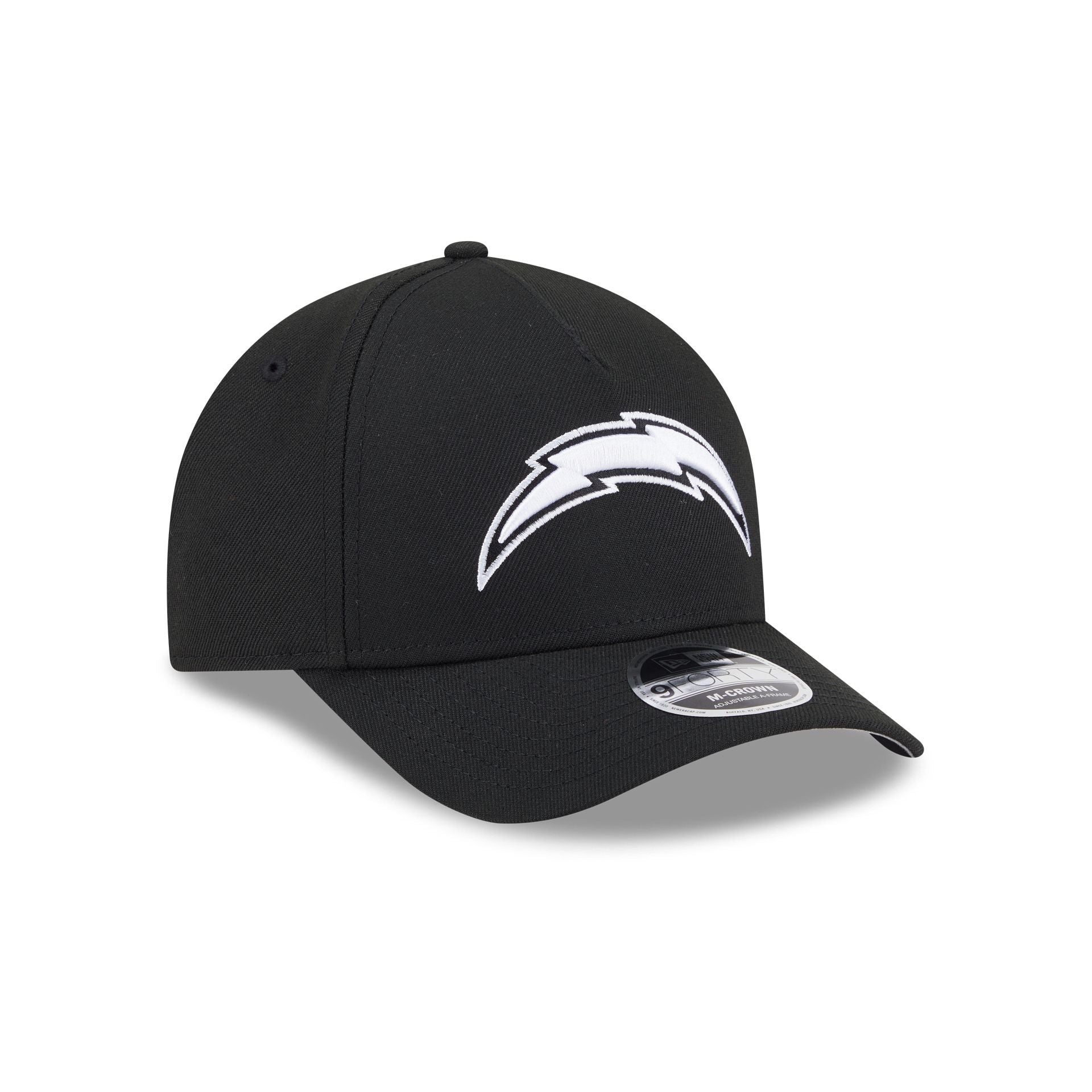 The Los Angeles Chargers Black & White 9FORTY M-Crown A-Frame Snapback features an embroidered Chargers logo at the front panels with an adjustable snapback closure at the rear and a gray undervisor.