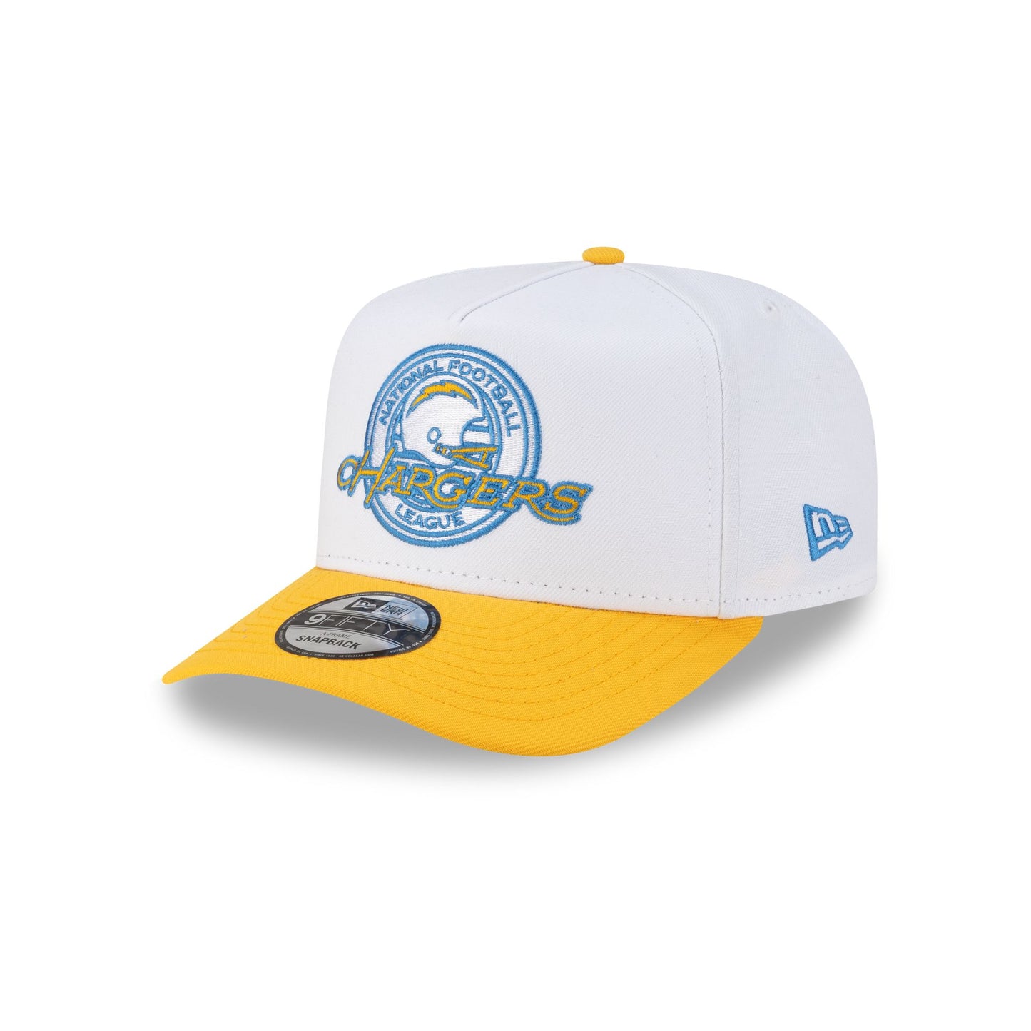 The Los Angeles Chargers Crest 9FIFTY A-Frame Snapback features an embroidered Chargers helmet crest at the front panels with an adjustable snapback closure at the rear and a gray undervisor.