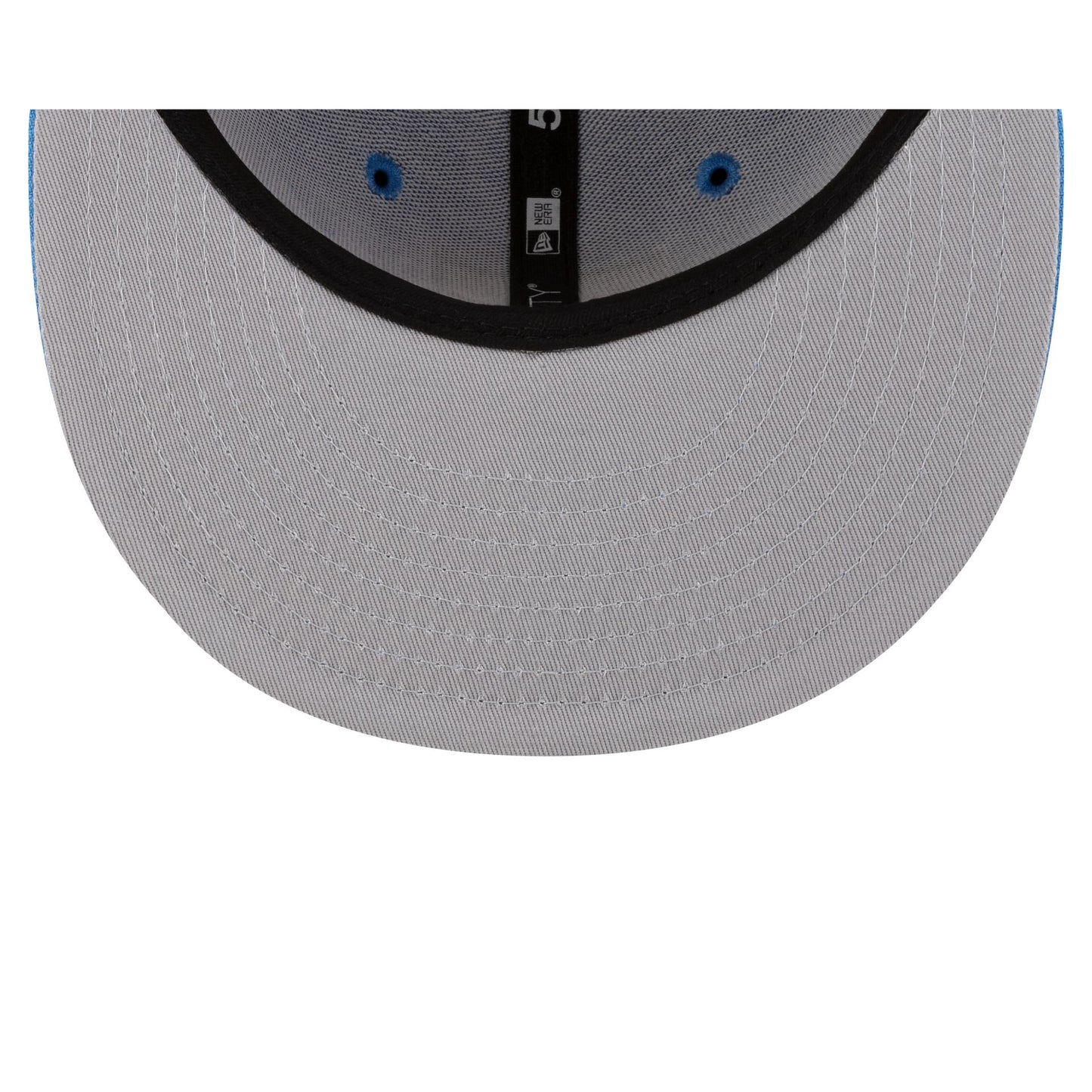 The Los Angeles Chargers Two-Tone Pinwheel 59FIFTY Fitted Cap features an embroidered Chargers Historic logo at the front panels with a matching team wordmark at the rear. Additional details include a blue and yellow paneled crown with a 50th Anniversary patch at the right-wear side and a gray undervisor.