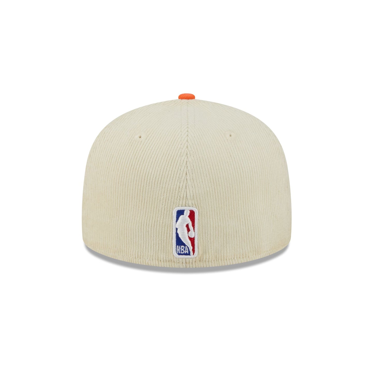 The Los Angeles Clippers 2025 City Edition Chrome White Corduroy 59FIFTY Fitted Cap features an embroidered Clippers City Edition logo at the front panels with a City Edition jock tag stitched at the right-wear side. Additional details include a corduroy fabrication, the NBA Logoman at the rear, and a gray undervisor.
