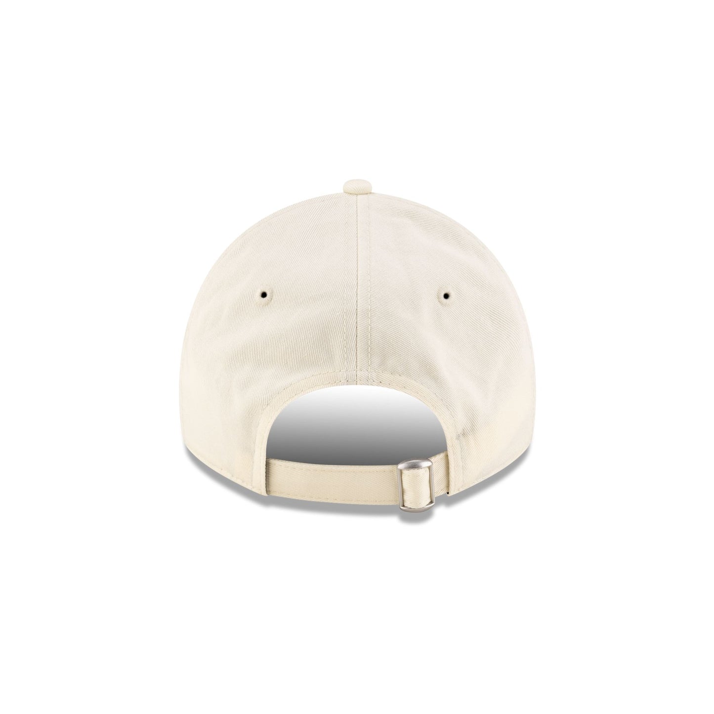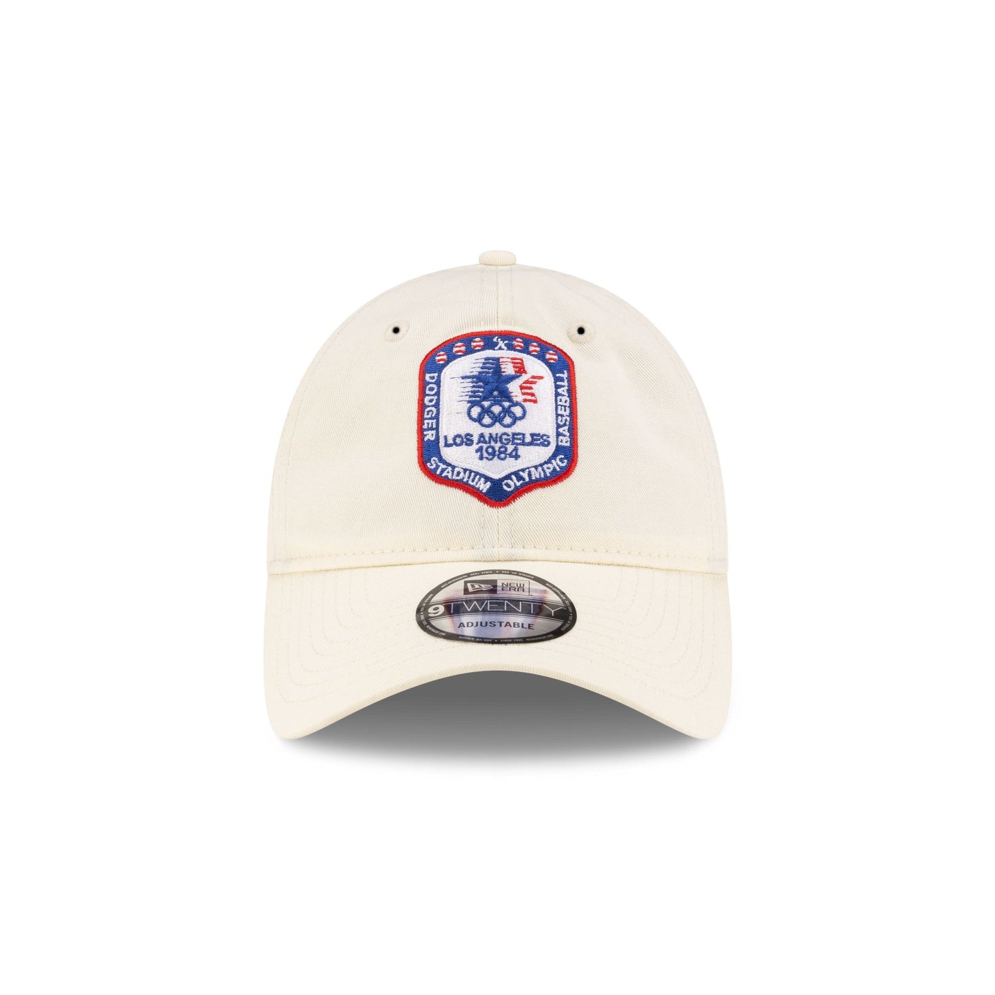 The Los Angeles Dodgers 1984 Olympics Chrome White 9TWENTY Adjustable Cap features an embroidered Dodger Stadium Olympic Baseball patch at the front panels with a Dodgers logo at the right-wear side. Additional details include an adjustable D-Ring closure at the rear and a gray undervisor.