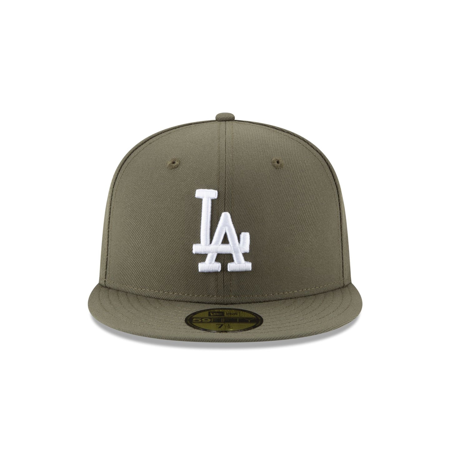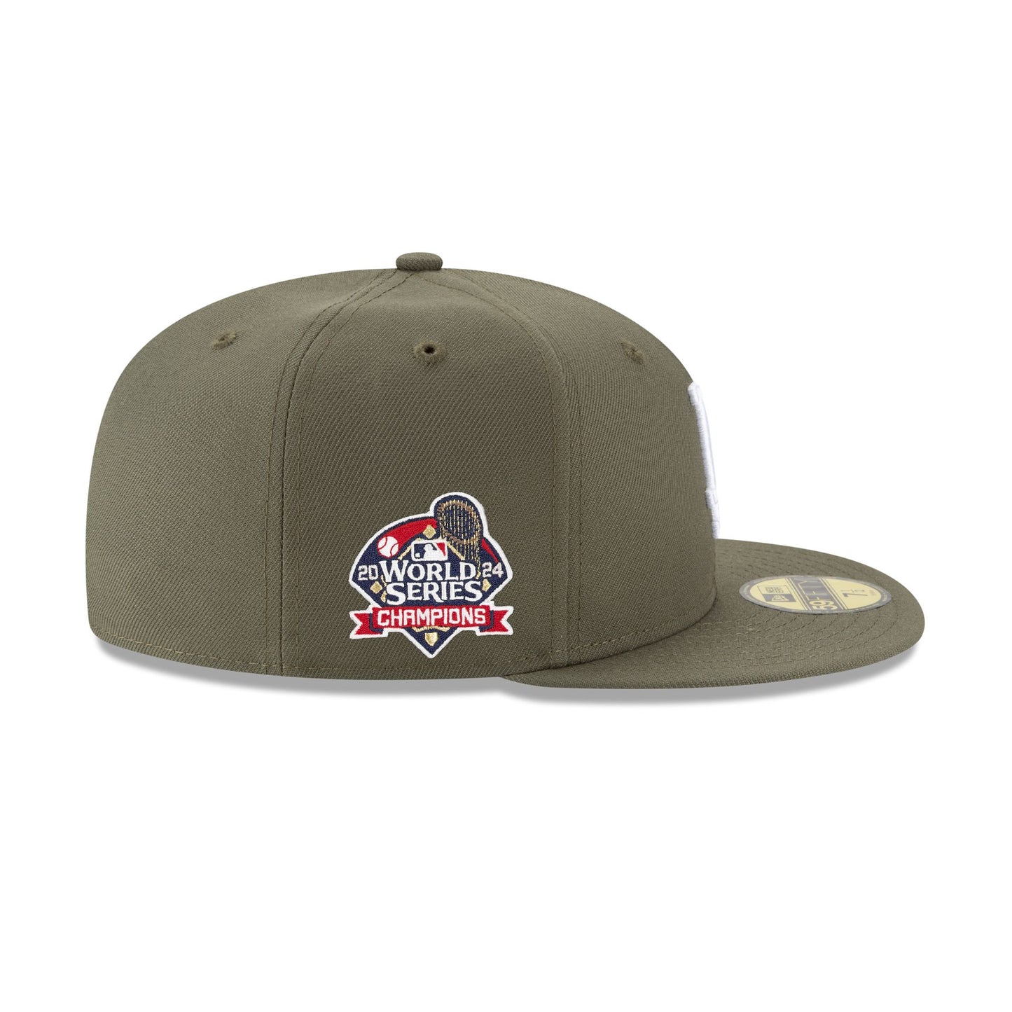 The Los Angeles Dodgers 2024 World Series Champions New Olive 59FIFTY Fitted Cap features an embroidered Dodgers logo at the front panels with an official MLB Batterman logo at the rear and a 2024 World Series Champions patch at the right-wear side.