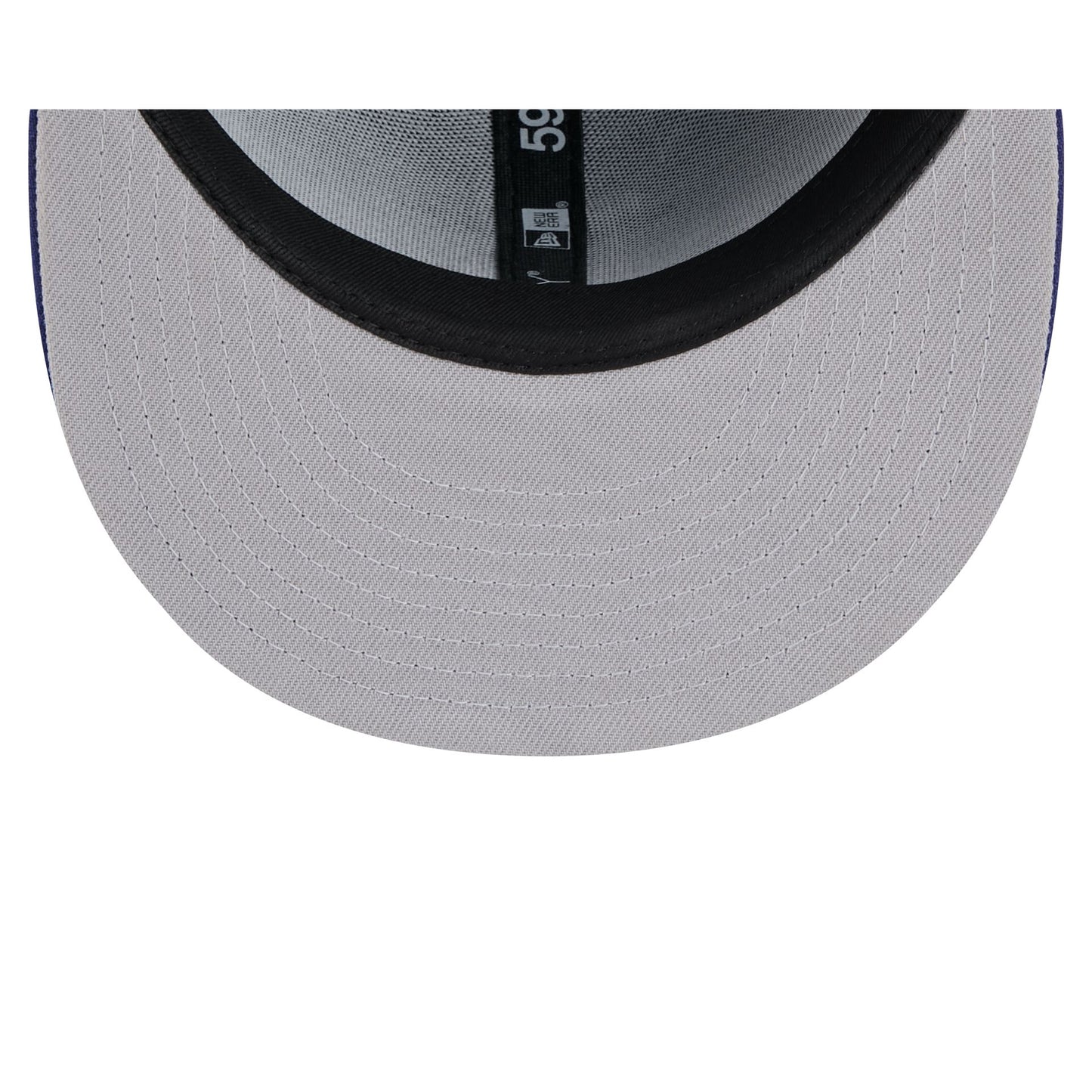 The Los Angeles Dodgers 2024 World Series Dark Royal 59FIFTY Fitted Cap features an embroidered Dodgers logo at the front panels with an official MLB Batterman logo at the rear. Additional details include a 2024 World Series patch at the right-wear side and a gray undervisor.