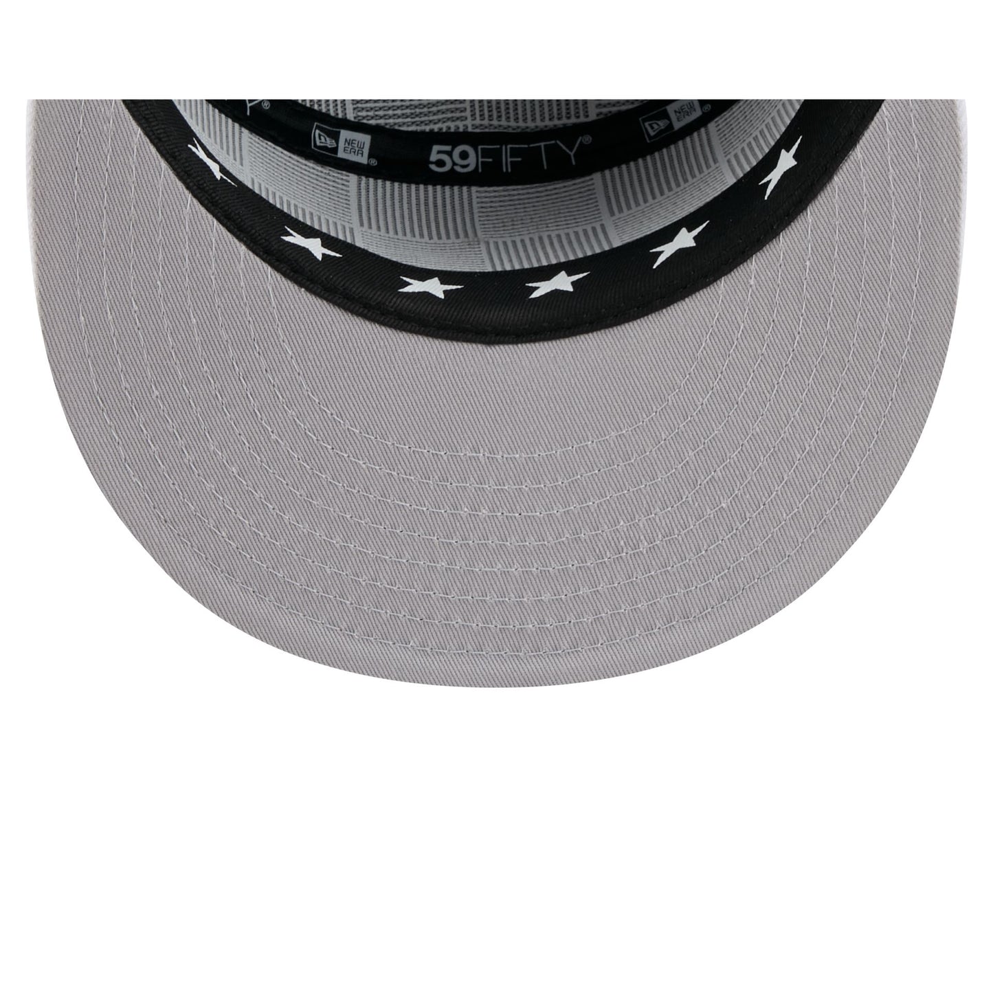 The Los Angeles Dodgers 2025 All-Star Game Split Panel 59FIFTY Fitted Cap features an embroidered Dodgers logo at the front panels against a split-crown construction with breathable mesh fabric at the side and rear panels. Additional details include stars at the top panel, a 2025 All-Star Game patch at the right-wear side, the MLB Batterman logo at the rear, and a gray undervisor. The cap also features screen-printed stars on the sweatband.