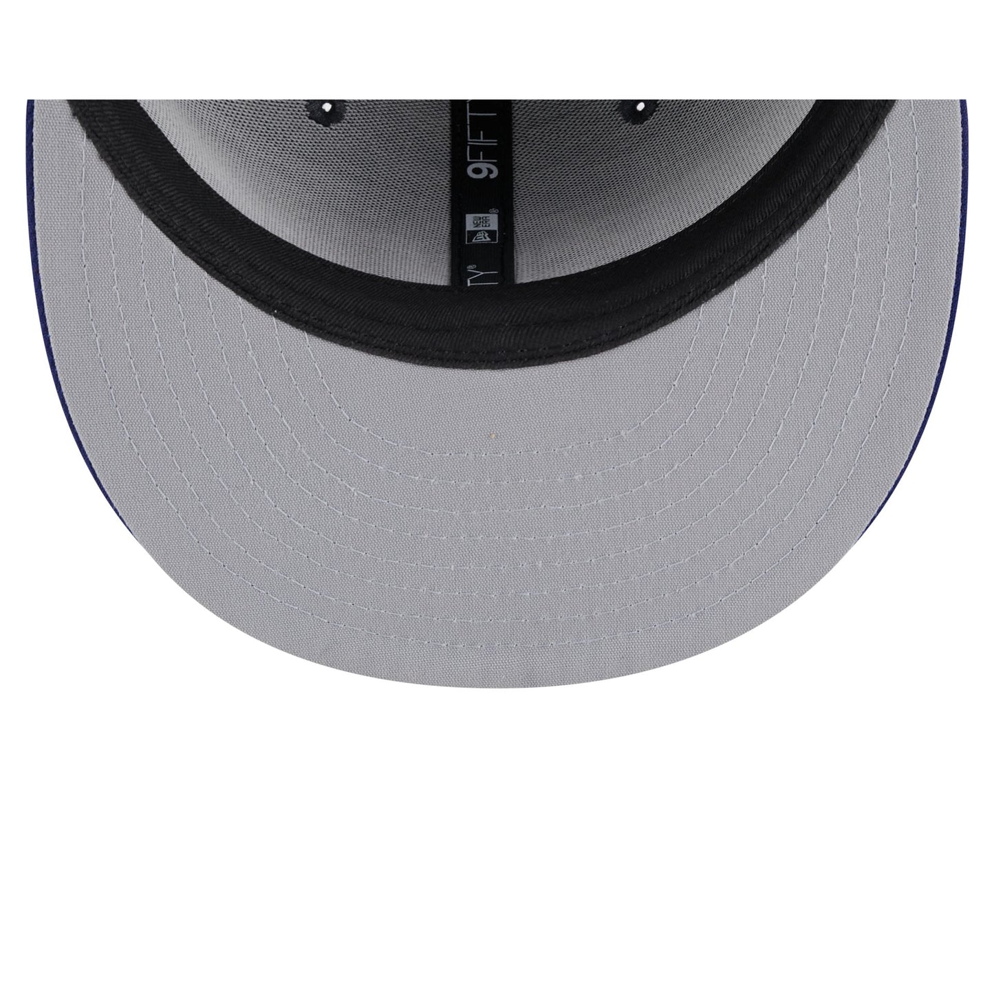 The Los Angeles Dodgers 2025 Batting Practice Gray 9FIFTY Snapback features an embroidered Dodgers logo at the front panels with a patch at the right-wear side. Additional details include a snapback closure at the rear and a gray undervisor.