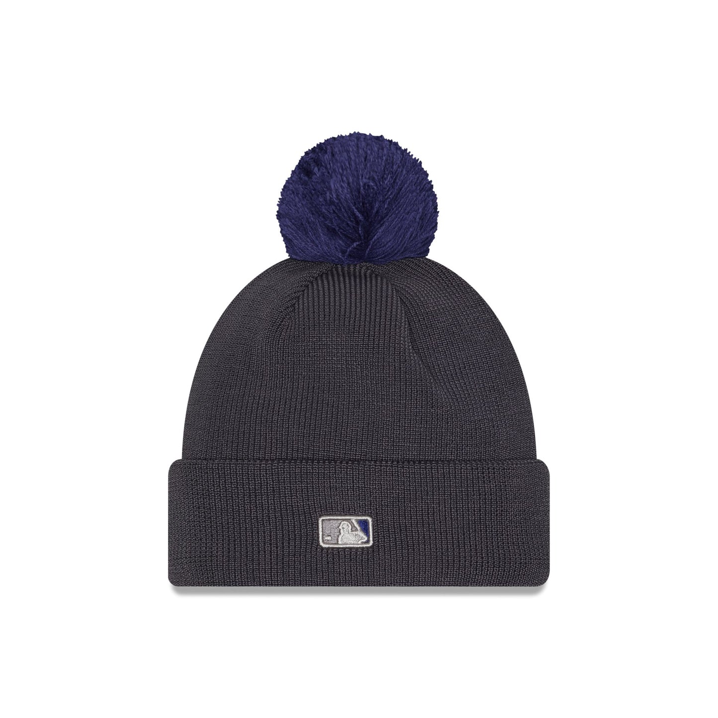 The Los Angeles Dodgers 2025 Batting Practice Pom Knit Hat features an embroidered Dodgers logo at the front cuff with a matching MLB Batterman logo at the rear. Additional details include a one-time removeable pom.
