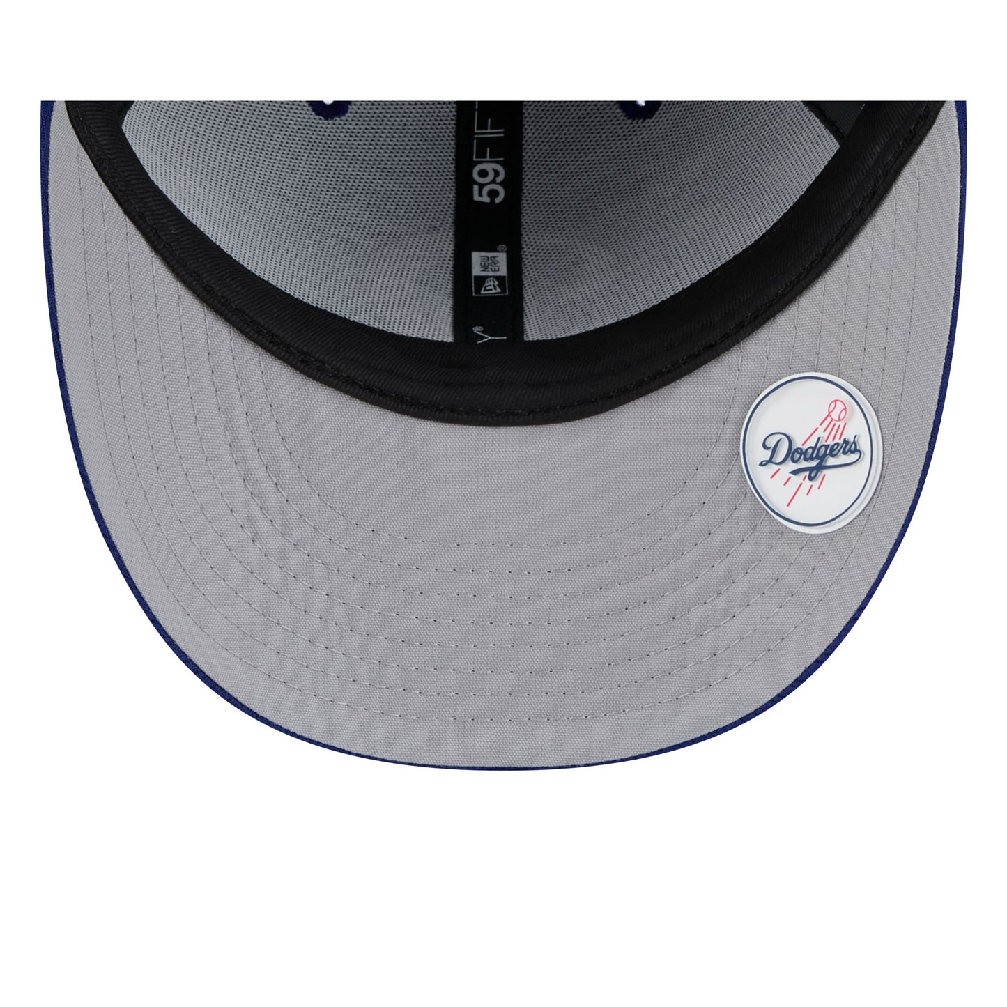 The Los Angeles Dodgers 2025 Clubhouse Alt Low Profile 59FIFTY Fitted Cap features an embroidered Dodgers alternate logo at the front panels with a matching MLB Batterman logo at the rear. Additional details include a dashmark mesh fabrication and a silicone logo on a gray undervisor.