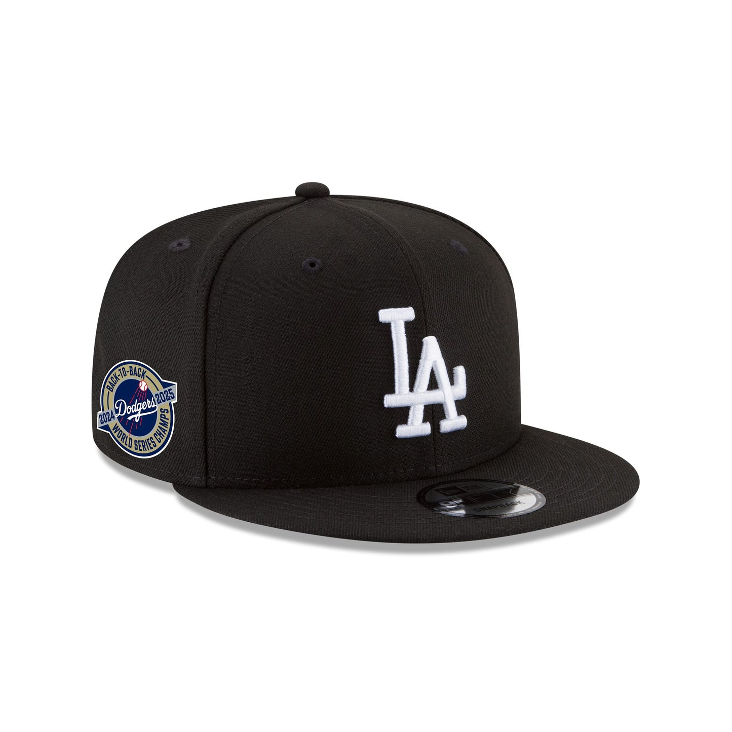 The Los Angeles Dodgers 2025 World Series Champions Back-to-Back Circle Patch Black 9FIFTY Snapback features an embroidered Dodgers logo at the front panels with a snapback closure at the rear. Additional details include a Dodgers Back-to-Back World Series Champs patch at the right-wear side with a gray undervisor.