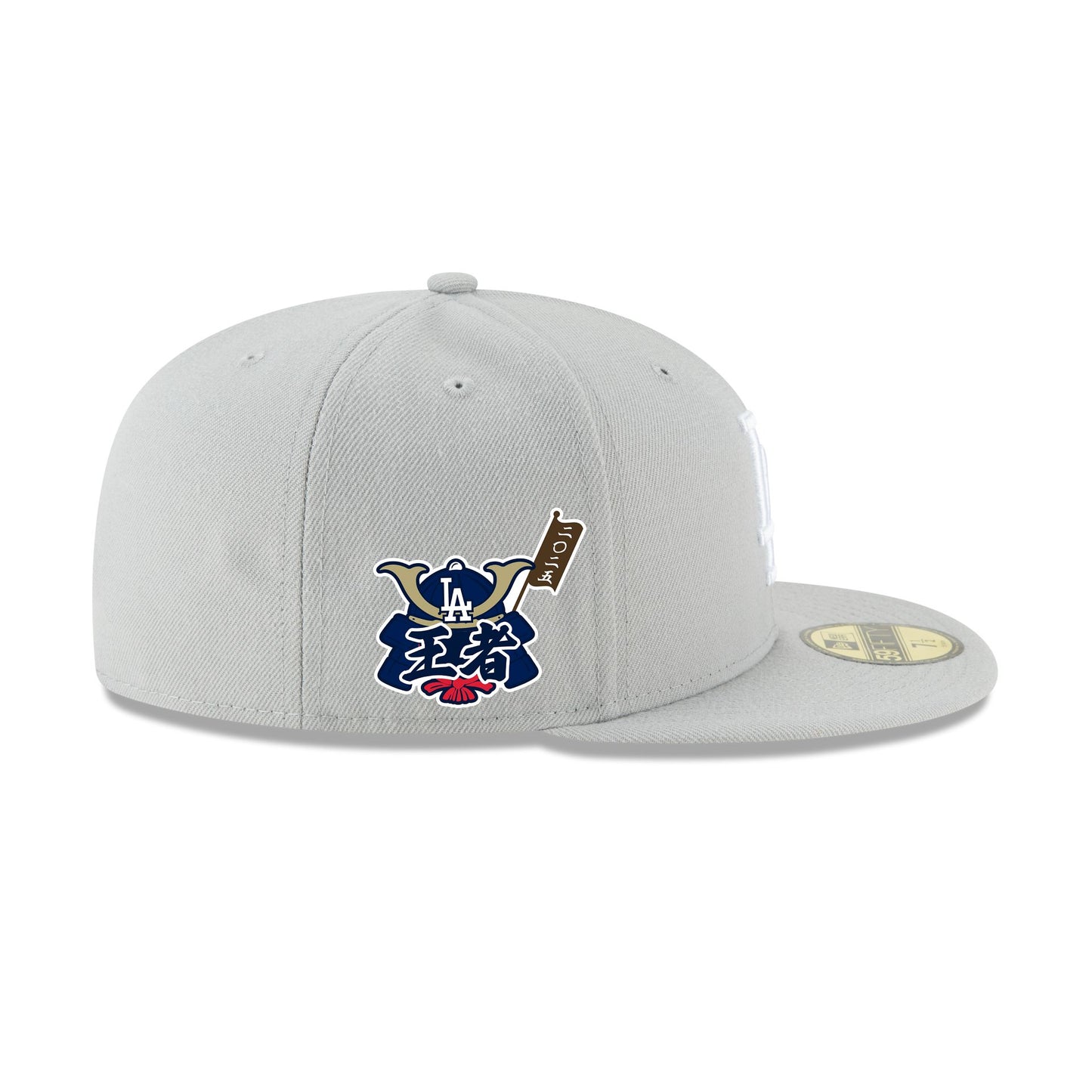 The Los Angeles Dodgers 2025 World Series Champions Samurai Patch Gray 59FIFTY Fitted Cap features an embroidered Dodgers logo at the front panels with a matching MLB Batterman logo at the rear, a 2025 Champions Samurai patch at the right-wear side, and a gray undervisor.