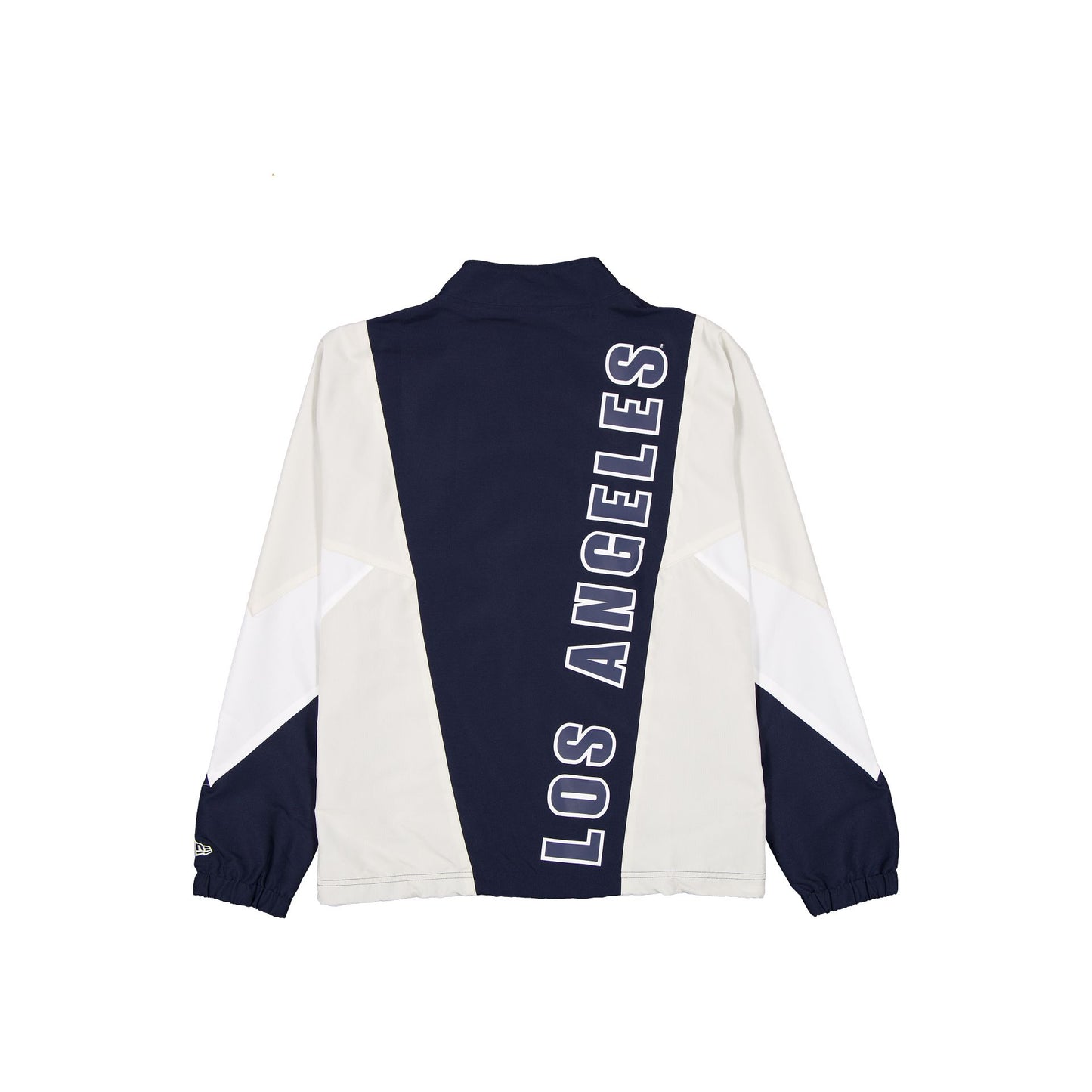 The Los Angeles Dodgers 2026 City Connect Color Block Windbreaker features a screen-printed Dodgers logo at the left chest with a matching team wordmark at the rear. Additional details include a full-zip closure at the front with side zip pockets, adjustable elastic drawstrings at the waist, and a woven team jocktag at the hem.