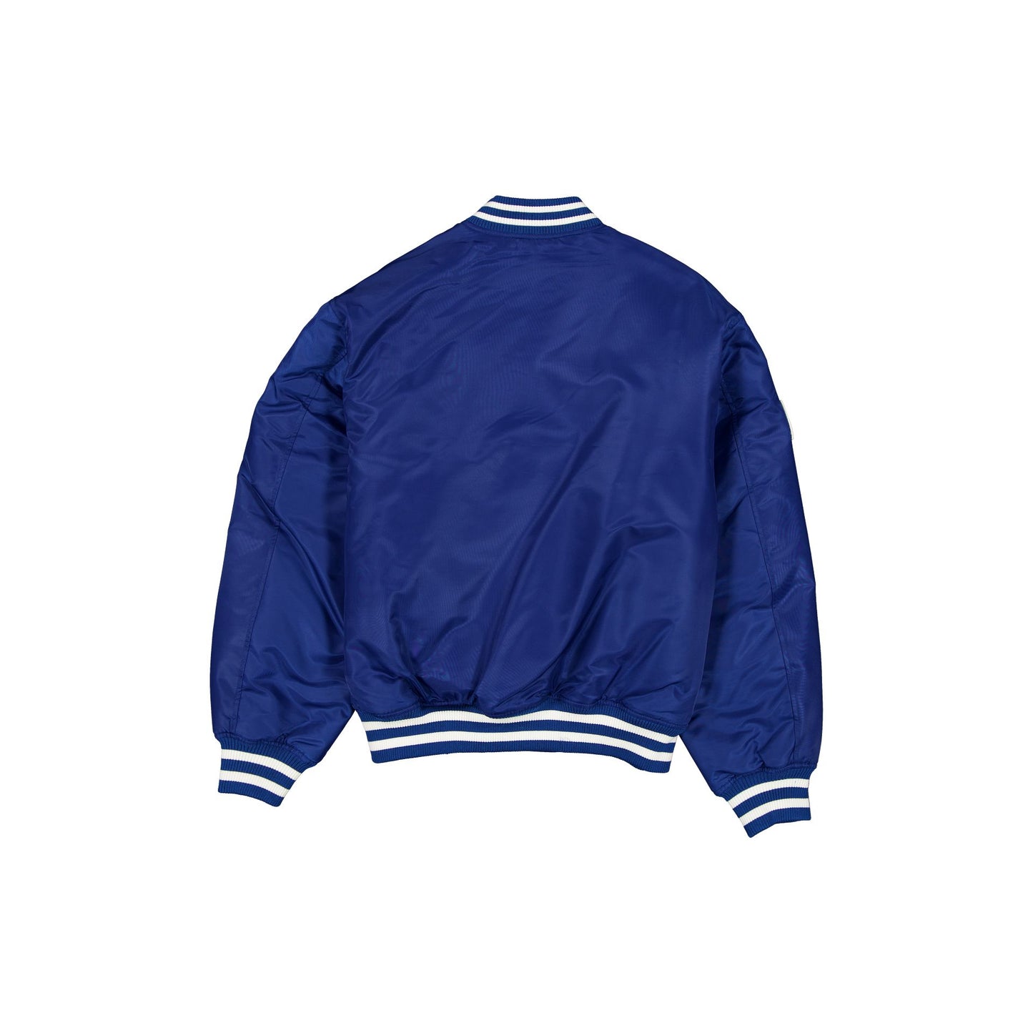 The Los Angeles Dodgers Authentic Blue Stadium Jacket features a stitched down applique Dodgers logo at the left chest with an alternate team logo patch at the left sleeve, a snap-button closure at the front, and snap-button side pockets. Additional details include an American Flag patch at the right sleeve with striped details at the banding on the sleeves and hem, an interior pocket at the left chest, and a quilted 3M insolation lining.