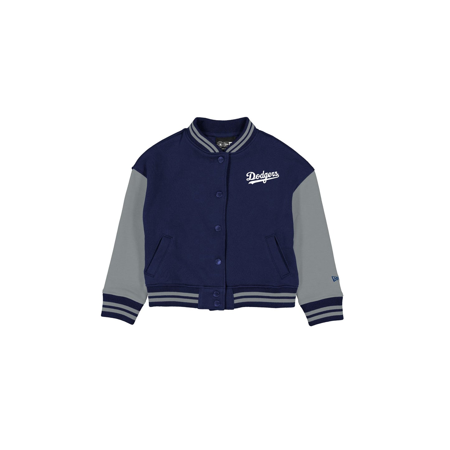 The Los Angeles Dodgers Baseball Girls Jacket features a screen-printed Dodgers logo at the left chest with a baseball girl graphic at the rear. Additional details include a snap button closure and front pockets.