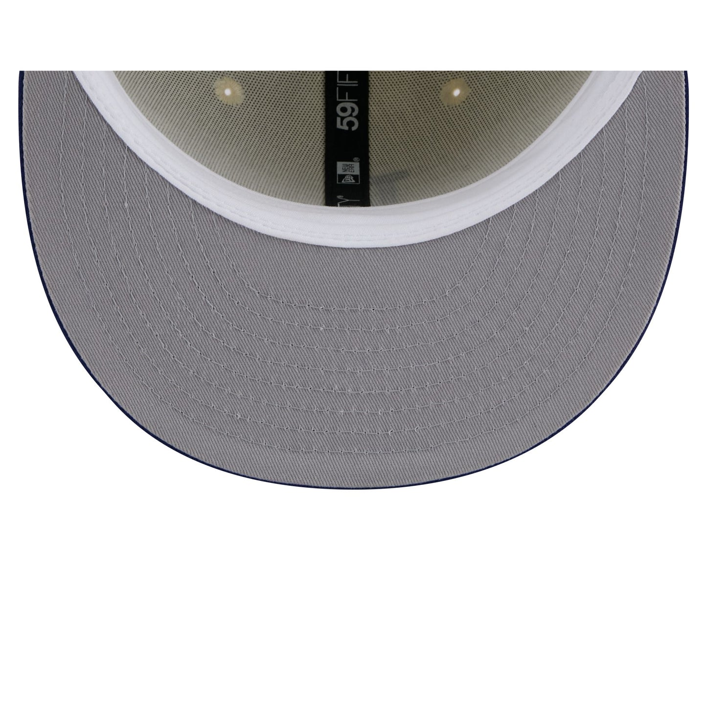 The Los Angeles Dodgers Chrome 59FIFTY Fitted Cap features an embroidered Dodgers logo at the front panels with a matching MLB Batterman logo at the rear, a blue visor, and a gray undervisor.