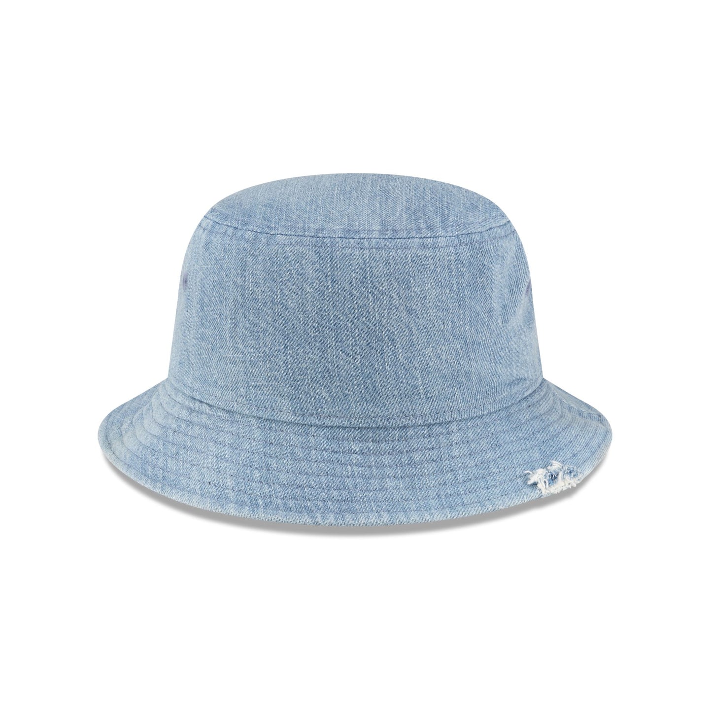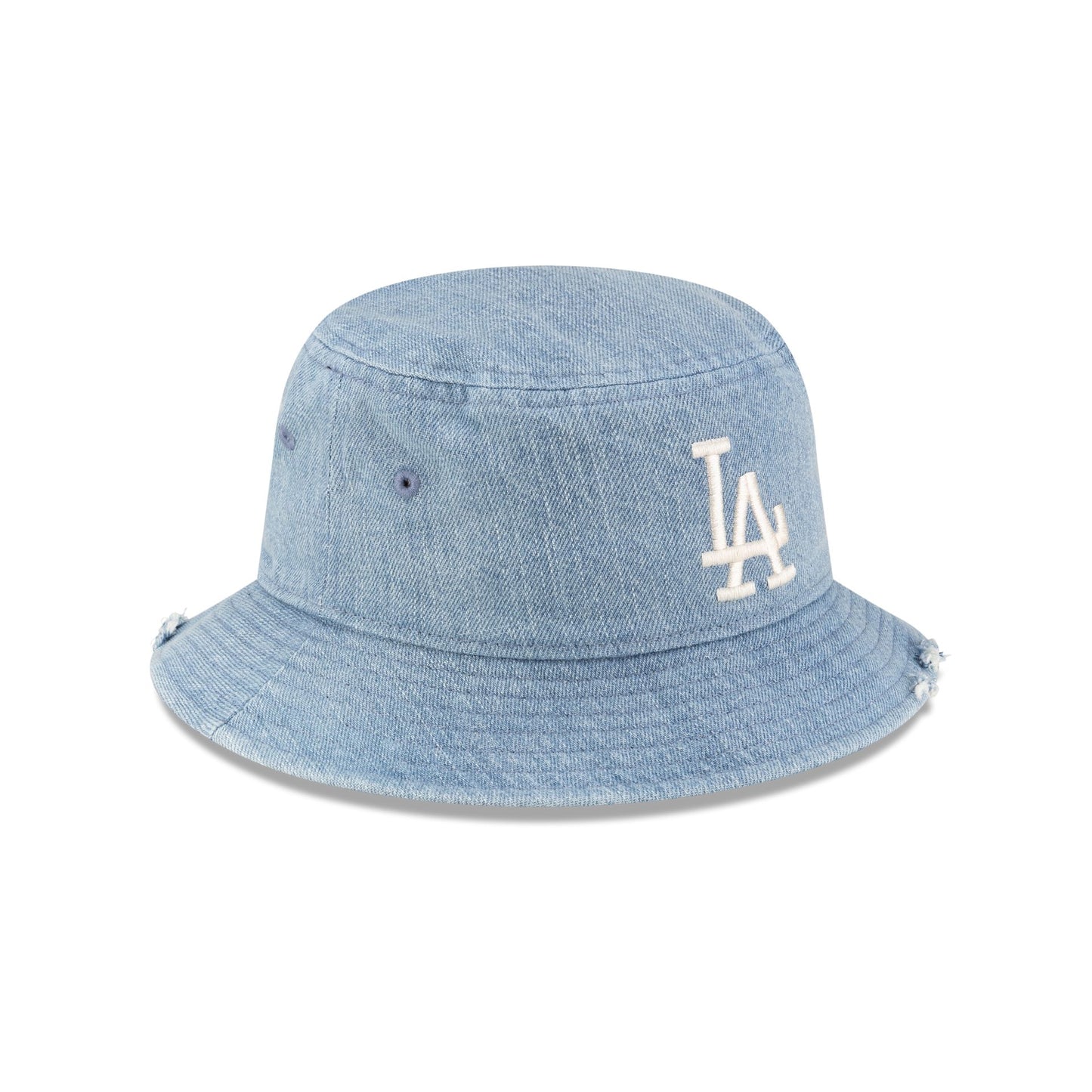 The Los Angeles Dodgers Distressed Denim Bucket Hat features an embroidered Dodgers logo at the front with a New Era Flag at the left-wear side and distressed details along the visor.