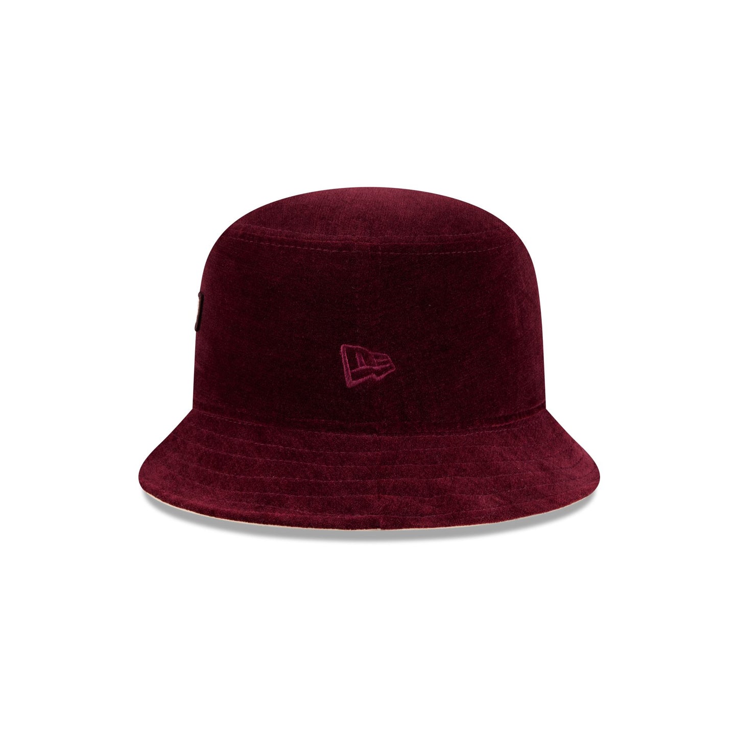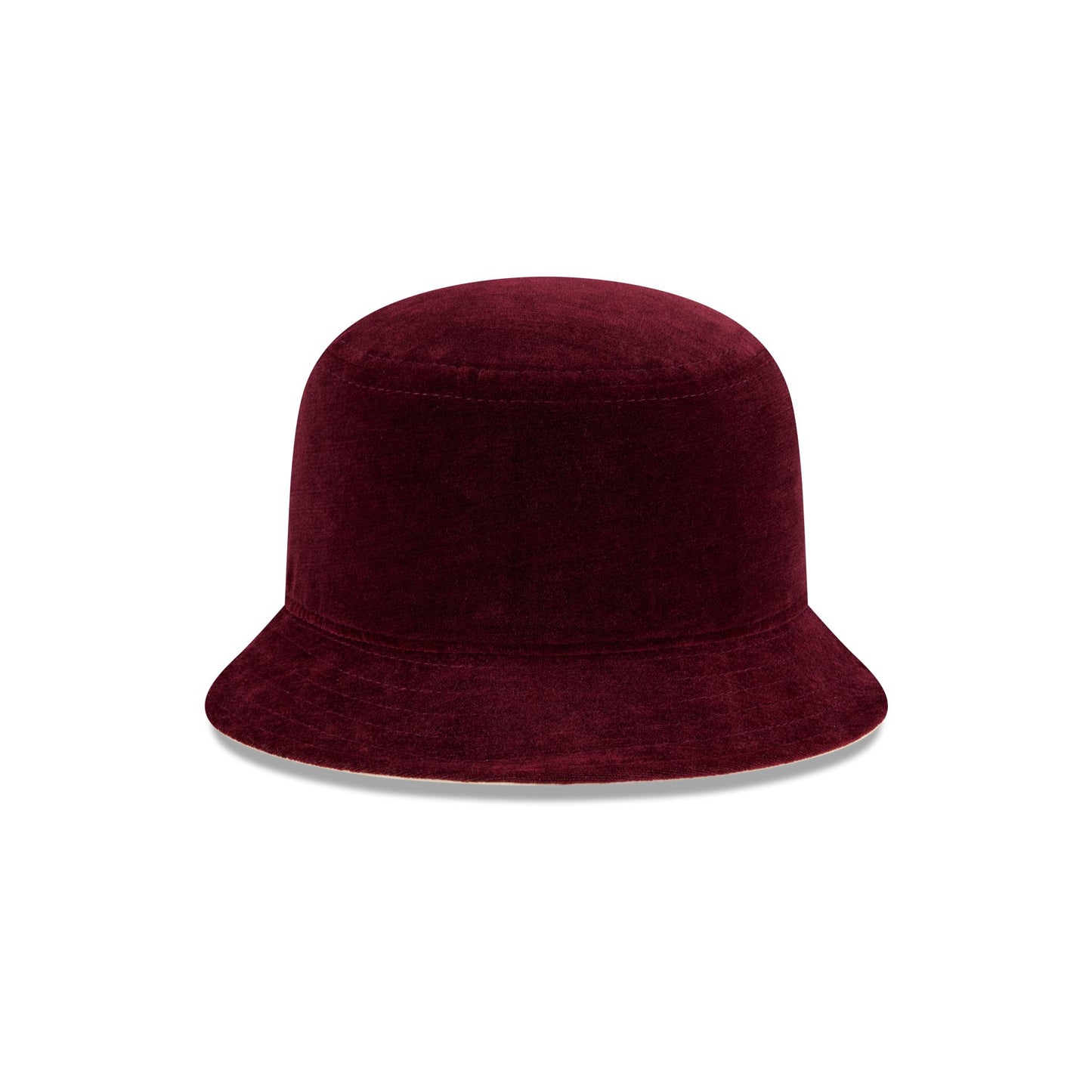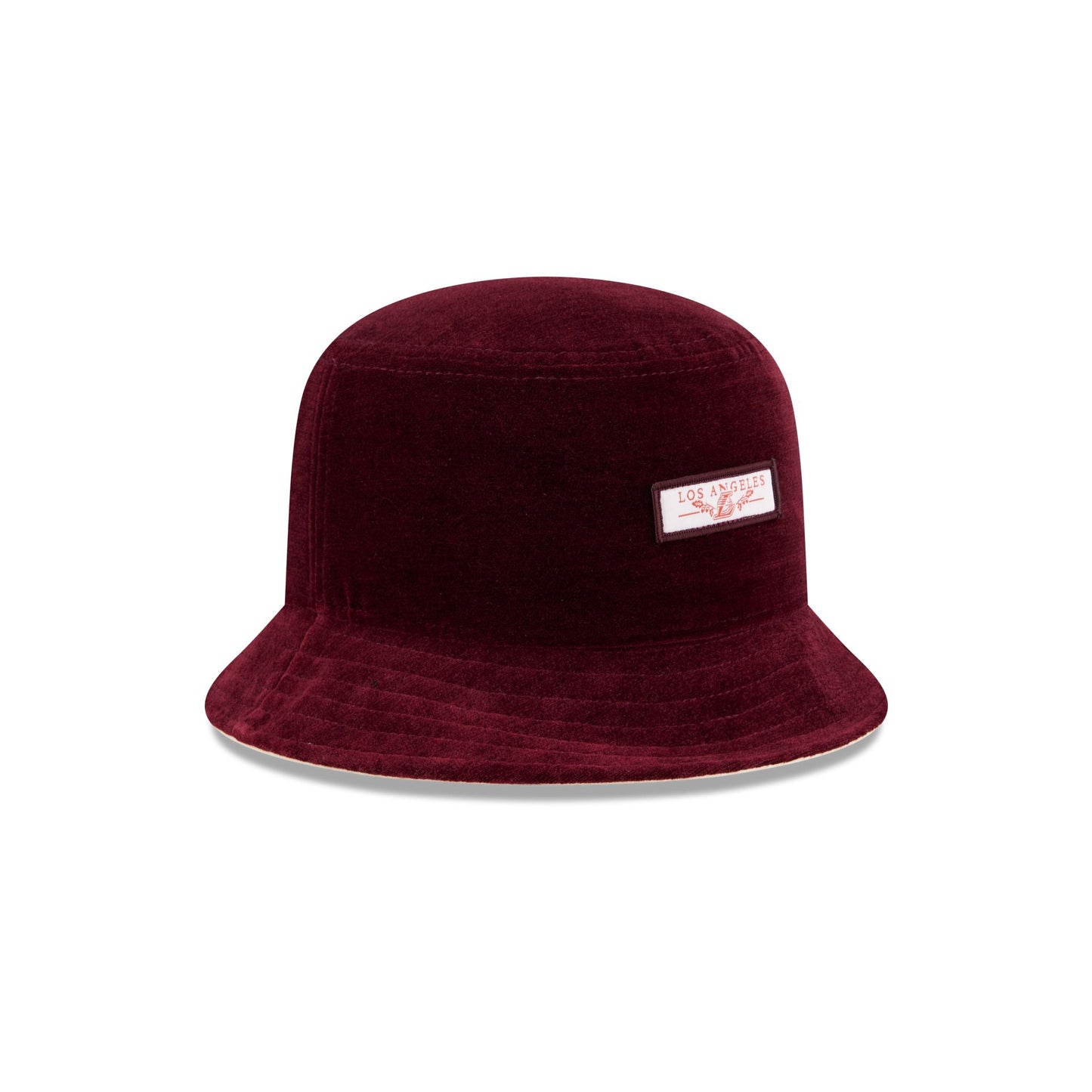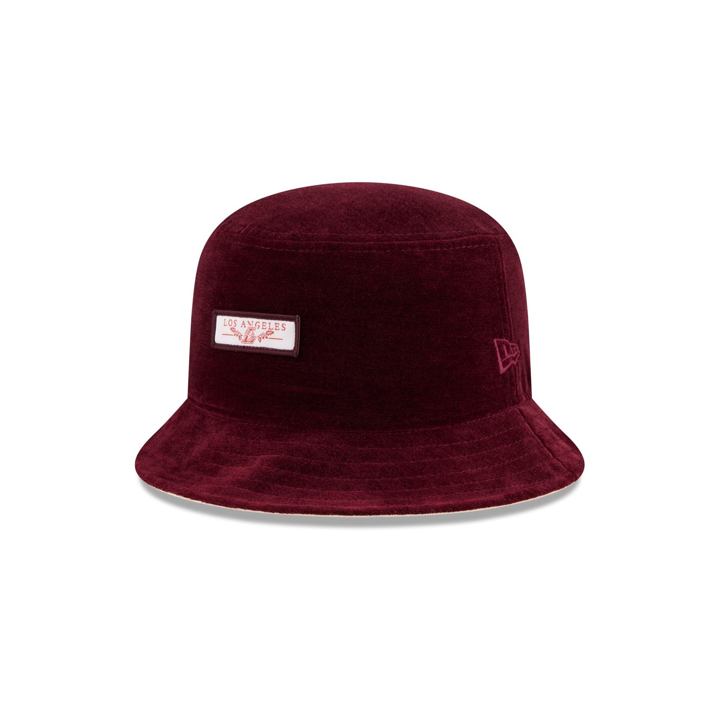 The Los Angeles Dodgers Fall Velvet Bucket Hat features a woven Dodgers tag at the front with a red velvet fabrication throughout.