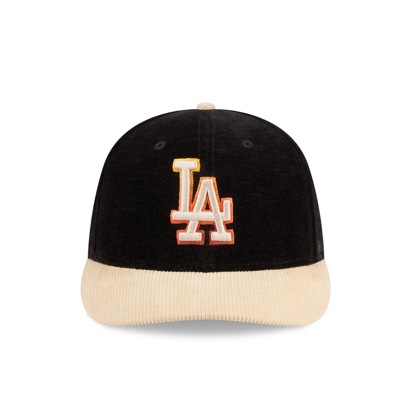 The Los Angeles Dodgers Fall Velvet Low Profile 59FIFTY Fitted Cap features an embroidered Dodgers fall gradient logo at the front panels against a velvet fabrication throughout. Additional details include an antique brass leather stitch down city plate at the right-wear side, a matching MLB Batterman logo at the rear, and a green undervisor.